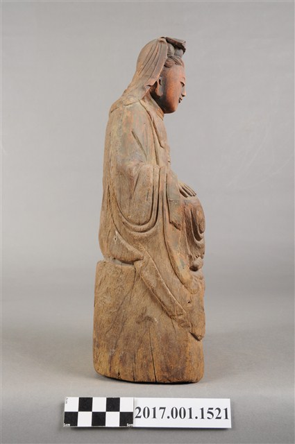 1.本件觀世音菩薩像採坐姿造形,以木雕方式製作,表面粧佛已脫落。背面開有橢圓形入神洞,封榫佚失,內容物件已取出。觀世音菩薩坐於岩座上,底部平整,正面看有幾處裂紋。觀世音菩薩臉孔娟秀,頭披風帽,身穿軟袍披肩。菩薩作遊戲坐姿態,跣足,左腿內彎平貼於岩座上,右腿屈膝小腿斜立於前。右手微彎,手掌輕撫於右膝上;左手手肘靠於左腿上,手掌上仰手指微彎虛握,托一只淨瓶,淨瓶上端缺損。