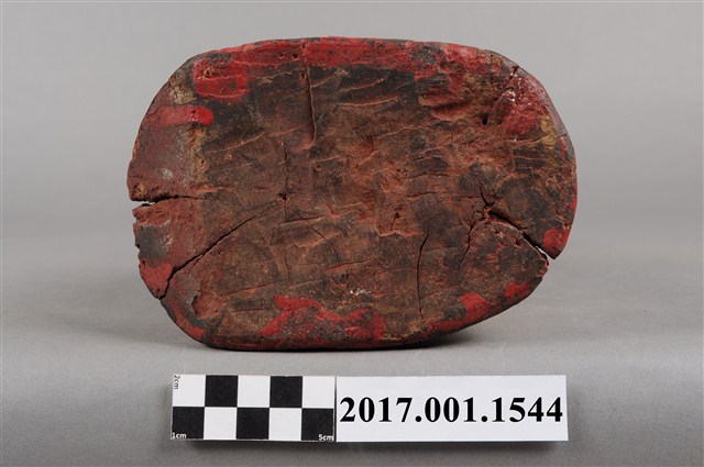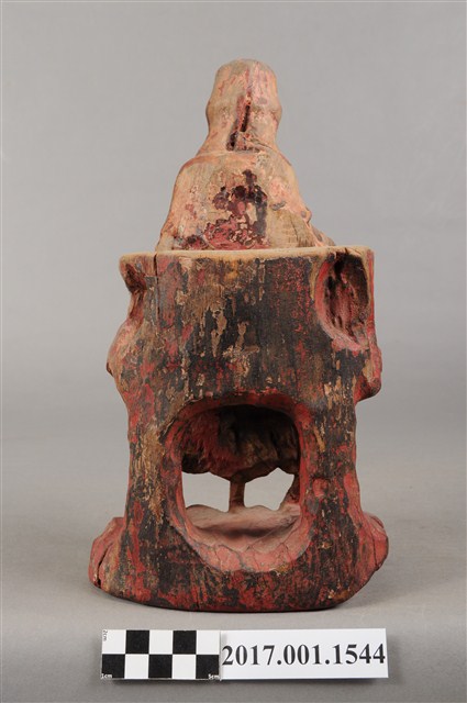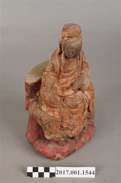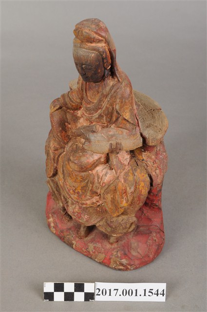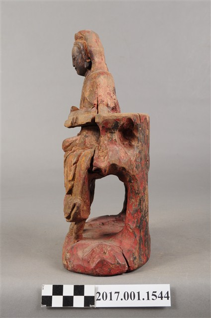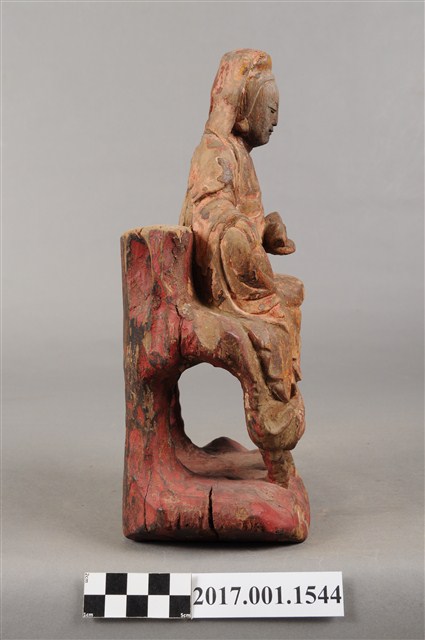 1.本件木雕觀世音菩薩像,作遊戲坐姿態,表面粧佛大部脫落,臉部有薰黑現象。菩薩臉部圓滿娟秀,雙眼垂視,頭盤高髻披風帽,身著斜襟袍服。左腿屈膝平坐於岩座上,足部隱於右腿之後,右膝朝向右上方,跣足。右手置於右膝上,手掌下垂,左手持一捲經卷,倚於左方之憑几上,袍服之下襬順岩座下垂,岩座前方中央一朵蓮花,兩側各一枝蓮葉。