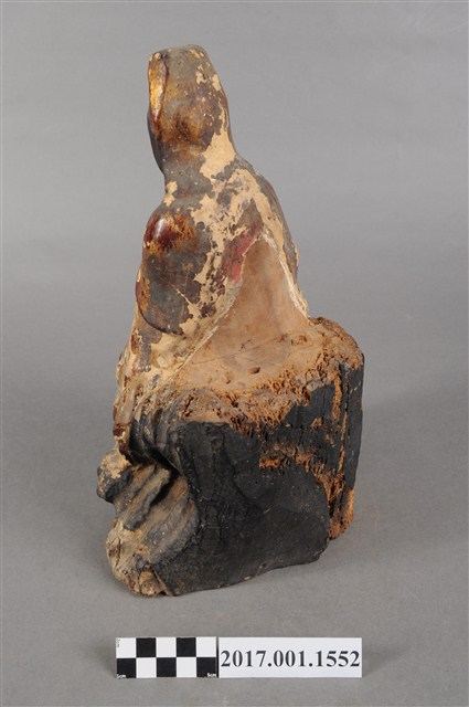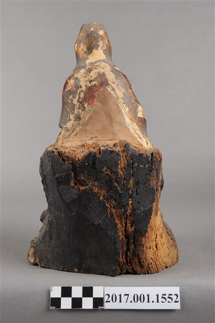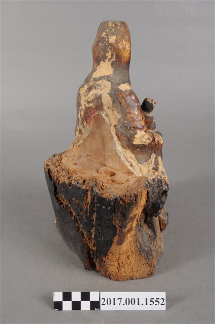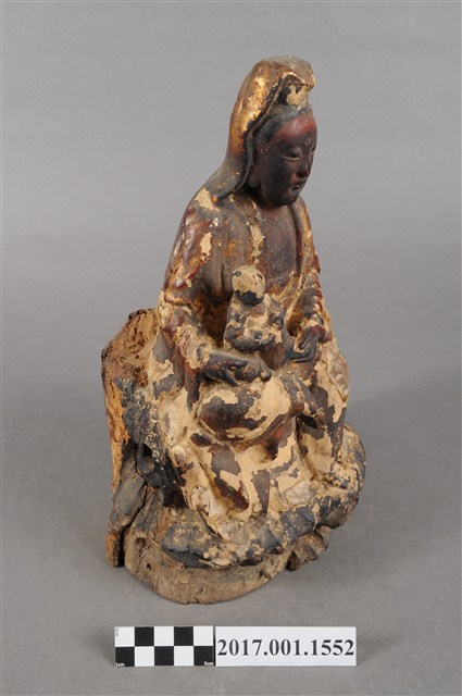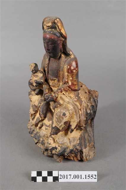 1.本件木雕觀世音菩薩像,帶有一名童子,為送子觀世音菩薩造形。菩薩衣袍裝飾呈大面積脫落,孩童之臉部,岩座後方有蛀蝕洞及裂紋,下背處有三角形裁切面,臉部、胸前、手部有污漬而呈現暗紅色。菩薩坐於岩座上,頭頂梳高髻,披風帽,臉型修長,雙眼平視,身穿寬袖袍服、披肩,袒胸,跣足,左腿下垂踏於岩座前之岩石,右腿向內屈膝,腳尖朝下,腿上坐一名孩童。左手內伸,托住孩童之左足,右手環繞孩童背後,手掌握住孩童之右膝,懷中孩童頭微上仰,雙左手內伸相對作玩耍狀。