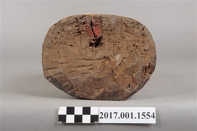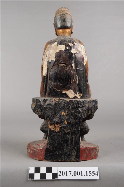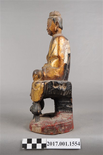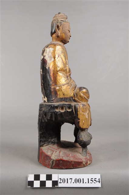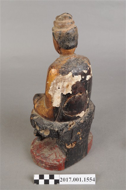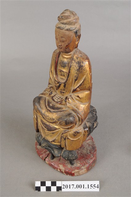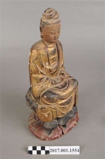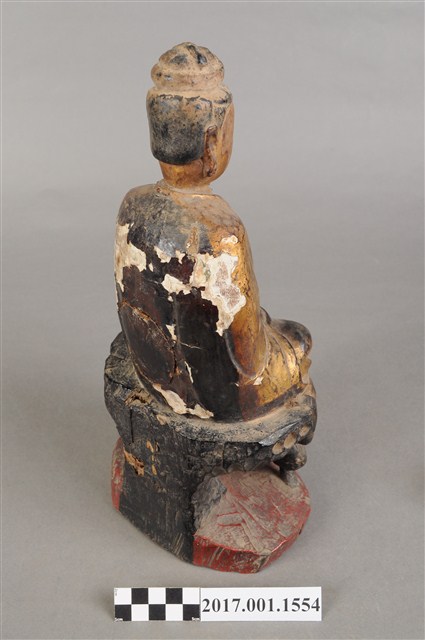 1.本件木雕觀世音菩薩像,作結跏趺坐姿態,表面之安金有脫落情形,露出底下之紅、黑色底,背後兩肩以下漆面有大片脫落,鼻端磨損,岩座前方一道裂紋,背後開一道圓形入神洞,封榫尚存。菩薩臉部圓潤,雙眼垂視,頭頂梳高髻,身著開襟袍服,雙腿盤坐,足部隱於袍服之內,雙手手掌朝上交疊,左下右上結禪定印,袍服之下襬順岩座下垂,岩座作圓形覆於袍服之內,袍服下中央作一株蓮葉,兩側各一朵含苞蓮花,作黑色,最下方之岩座作紅色。