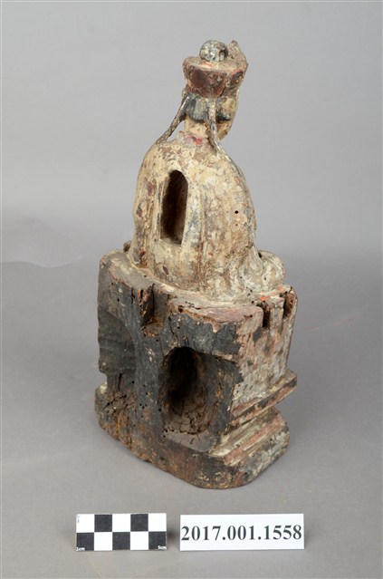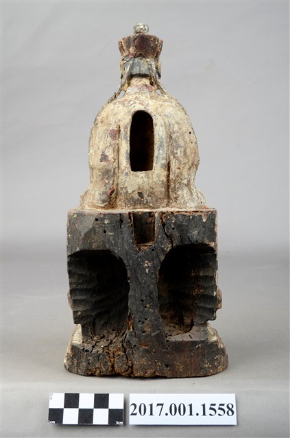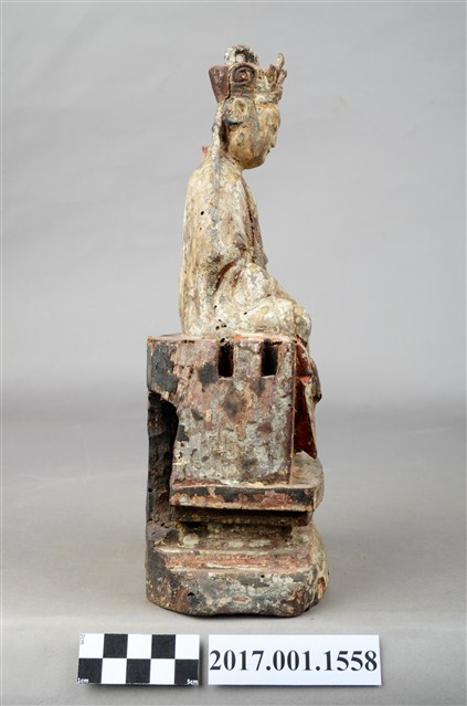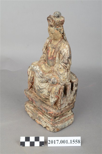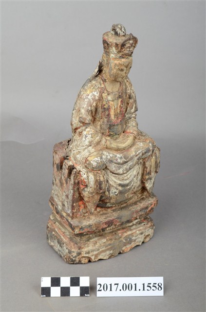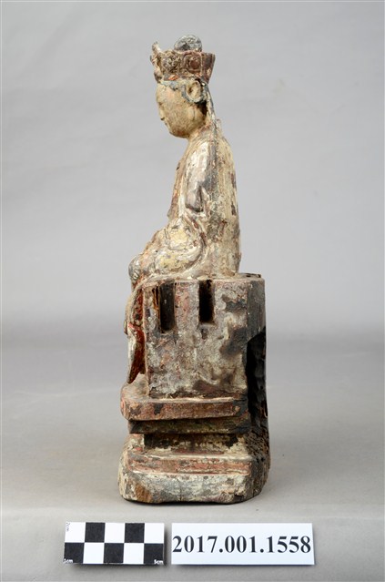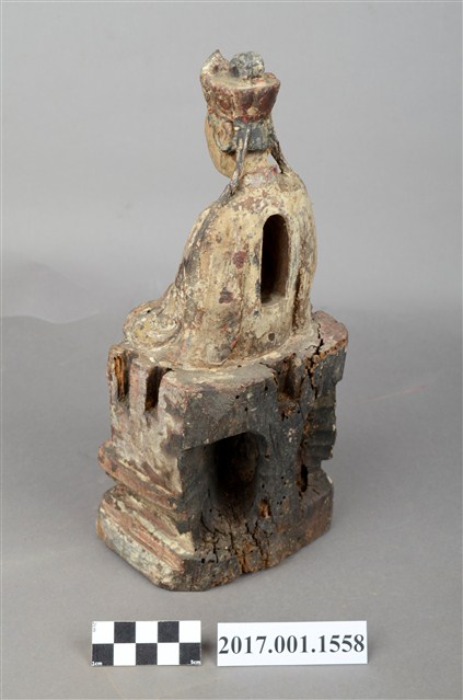 1.本件木雕觀世音菩薩像,作結跏趺坐姿態,表面粧佛大部分已除去,背面衣袍及基座有蛀蝕孔,背後開有橢圓形入神洞,內部物件已取出。菩薩臉部成鵝蛋形,雙眼平視,頭戴毘盧冠,前方有一尊小化佛,冠帶自耳後垂至肩上,身著開襟寬袖袍服,雙腿盤坐,足部隱於袍服下襬之內,雙手手掌朝上交疊,左下右上結禪定印,袍服之下襬順臺座下垂,臺座作方形束腰須彌座,臺座後方兩側開空,獨留中央一柱,頂端開有梯形陰榫,作為插背光處,背光已失。