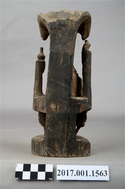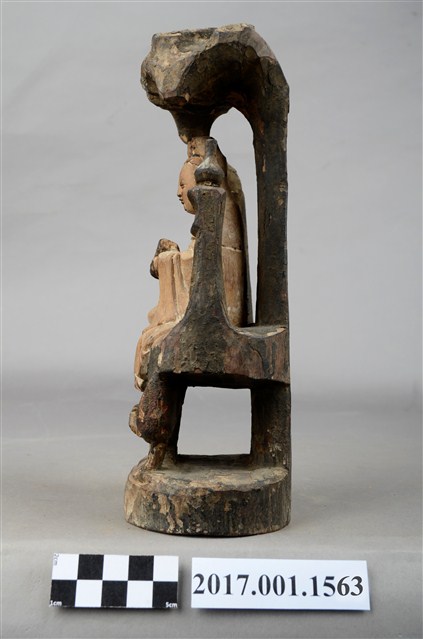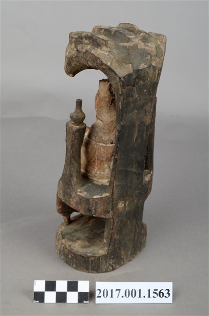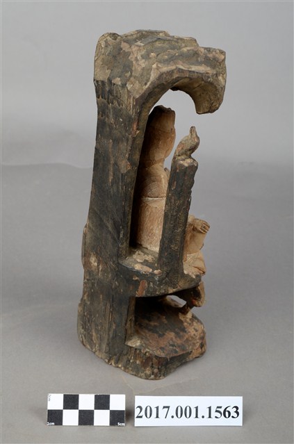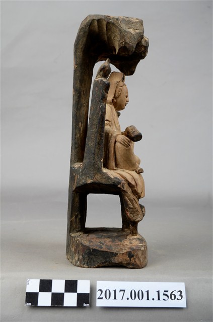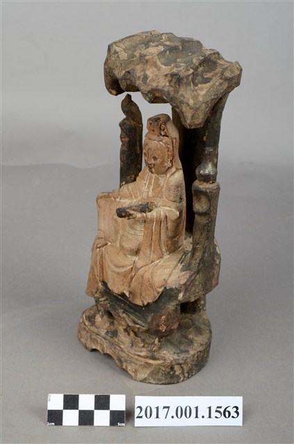1.本件木雕觀世音菩薩像,作遊戲坐姿態,身後有延伸之至頭頂之岩石寶蓋,為普陀巖觀世音菩薩造形,身軀粧佛已除去,眼鼻口部有污漬,身後寶蓋及岩座保留青黑色粧佛。菩薩臉部呈橢圓形,雙眼垂視,頭盤高髻,披風帽,髮髻前方有一方三角牌,為化佛位置,身著斜襟袍服,坐於岩座上。左手前伸持經卷,右手手掌朝下,置於右膝之上。跣足,左腿屈膝內伸,足部隱於右腿之後,右腿屈膝,膝蓋朝右上方,袍服下襬垂於臺座之前。身軀兩旁各凸出一根岩柱,身左柱頂置一只淨瓶,身右柱頂站立鸚鵡。