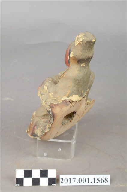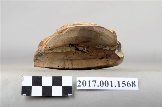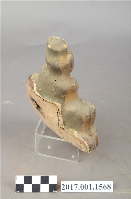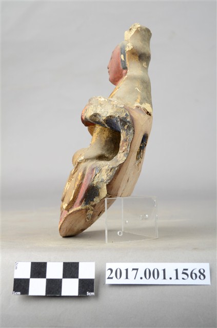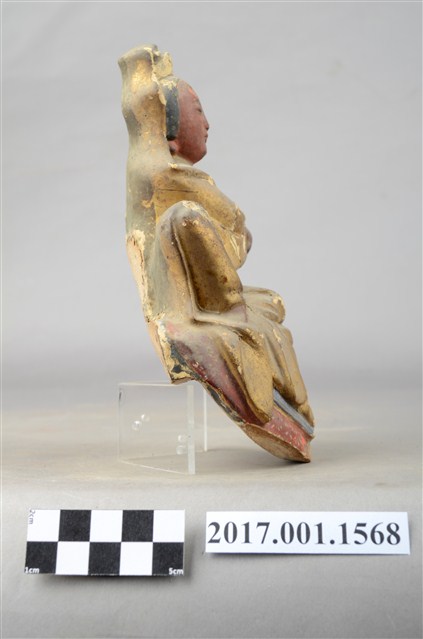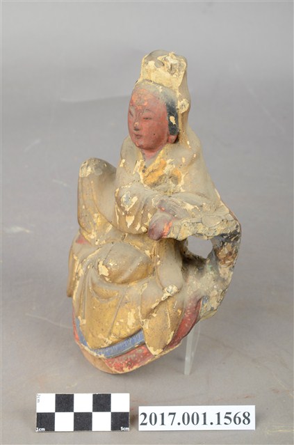 1.本件木雕觀世音菩薩像,作遊戲坐姿態,表面粧佛有局部脫落,臺座後方及底部有蛀蝕。菩薩臉部呈鵝蛋形,施朱漆,雙眼平視,頭盤高髻戴山形冠,披風帽,坐於岩座上。左手小臂擱於身左之憑几上,右手平伸於胸前,手掌扶於右手腕上。左腿屈膝內伸,平坐於臺座之上,足部隱於右腿之後,右腿屈膝,膝蓋朝右上方,袍服之下襬下垂,最下方之臺座已失。