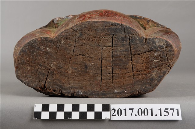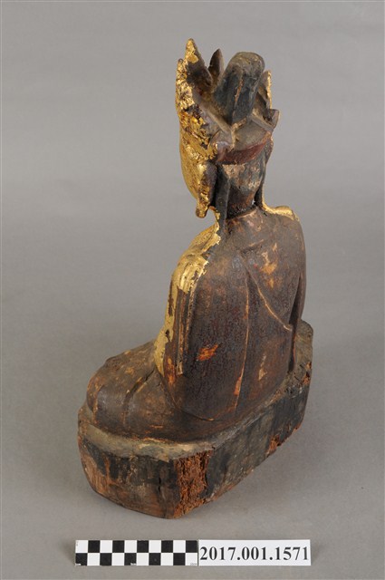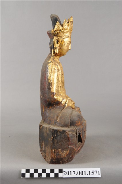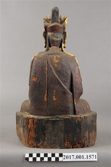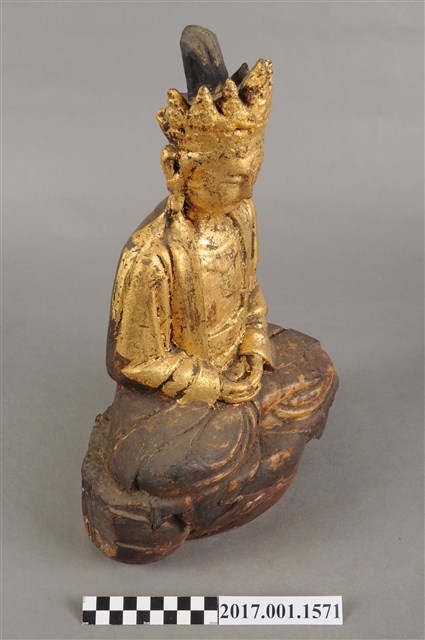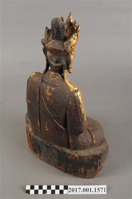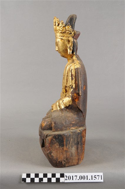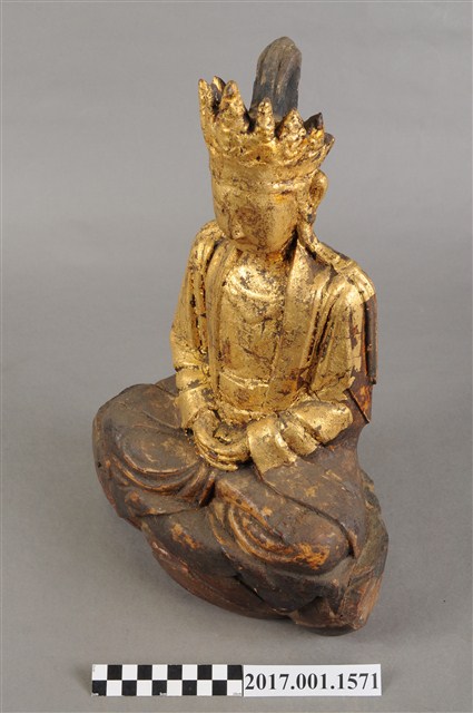 1.本件木雕觀世音菩薩像,作結跏趺坐姿態,表面以安金為主,上身安金保存良好,下身及背後佈滿污漬,蓮座底部有數道十字形裂紋。菩薩臉部安金,雙眼垂視,耳垂及肩,頭戴山峰形毗盧冠,頂端凸出一豎髻,冠前方有一尊小化佛,冠帶自耳後垂至肩上,身著開襟寬袖袍服,雙手手掌朝上在腹前相疊,左上右下,結禪定印,雙腿盤坐於蓮座之上,雙足隱於袍服之內。