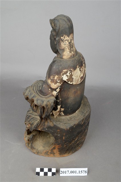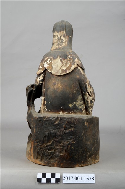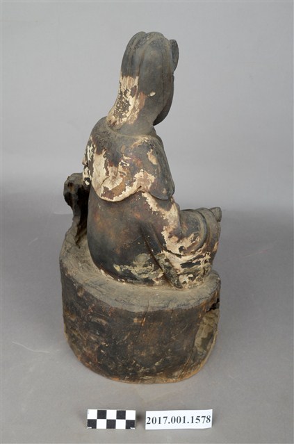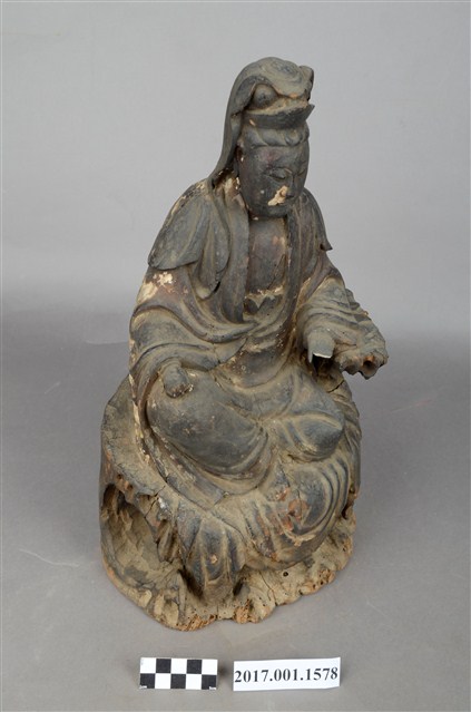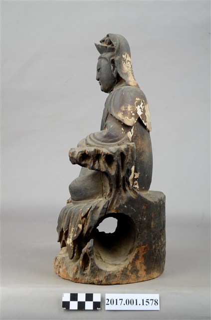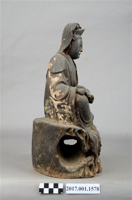 1.本件木雕觀世音菩薩像,作遊戲坐姿態,表面佈滿污漬,鼻、嘴之右小面積剝落,左胸前及右手衣袖有縱裂紋,左手手指缺損,岩座下端前方有蛀蝕。菩薩臉部修長,雙眼垂視,頭盤高髻戴山形冠,披風帽,身著開襟袍服、披肩,袒胸,左手小臂倚於身左之憑几上,右手半握拳置於右膝上。左腿屈膝內伸,坐於岩座上,足部隱於右腿之後,右腿屈膝,跣足,膝蓋朝右上方,袍服下襬垂於岩座之前。