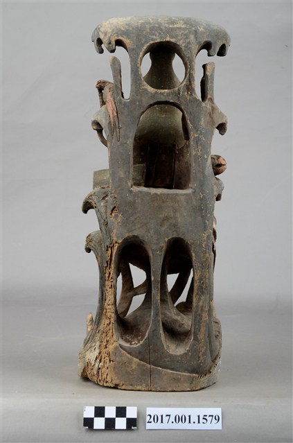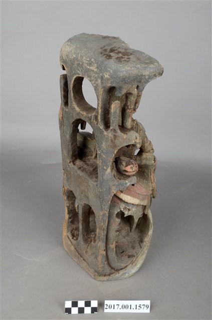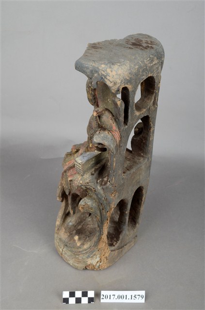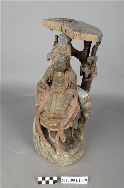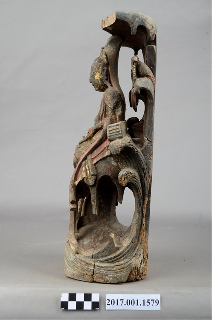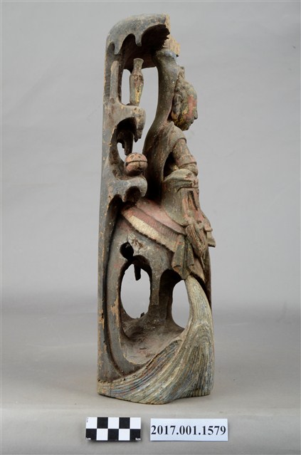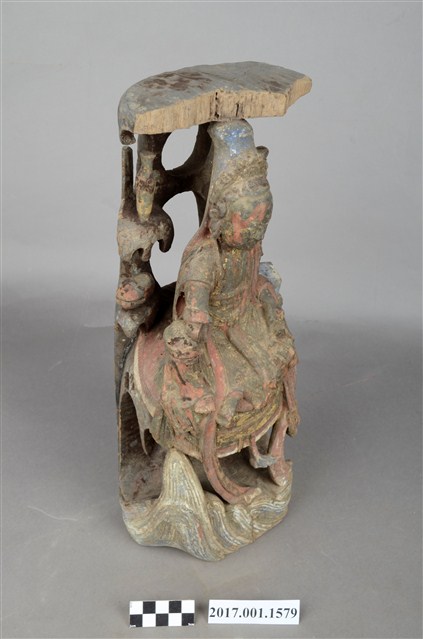 1.本件木雕觀世音菩薩像,作遊戲坐姿態,表面佈滿污漬,面部、衣帶露出朱紅色,頂上寶蓋前段缺損,右手掌斷裂,身軀後腰處開一道方形入神洞,封榫尚存。菩薩臉部作鵝蛋形,雙眼垂視,頭梳通天高髻,戴山形小冠,上身著赤裸著披肩,肩掛飄帶纏繞兩手間,下端垂於岩座下,左前伸掌心朝上作蓮花手,右手手肘置於右膝之上,手掌削除。跣足,左腳屈膝內伸坐於岩臺上,右腳膝蓋朝上。背後岩屏上升至頭上成為寶蓋,上下各挖一道圓形與穹窿形洞。菩薩左肩後方岩石上站一隻口銜手珠之鸚鵡,右後方岩石上置一只淨瓶,左手旁一封經函,右手旁一只木魚,袍服下襬垂於岩座前,岩座下方作海浪紋。