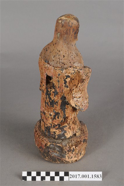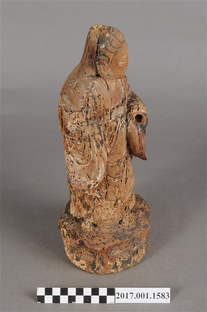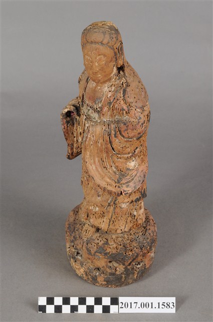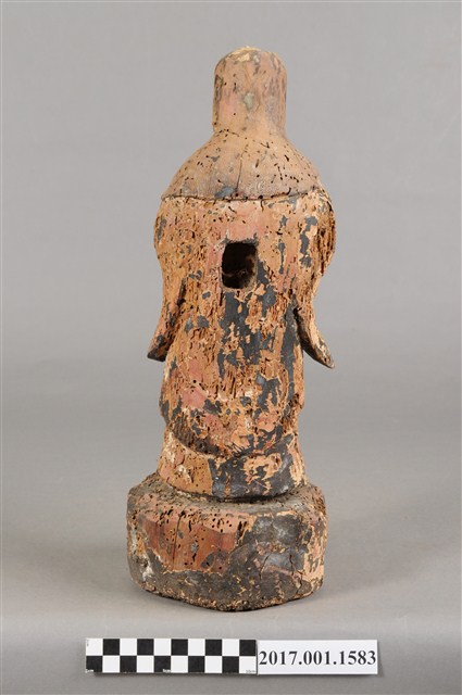 1.本件木雕觀世音菩薩像,作立姿造形,表面殘留有朱紅、黑等色塗飾,衣袍、臺座散佈蛀蝕孔,雙手手掌缺損,右手上臂後方與袍服蛀蝕,頭頂髮髻亦缺損,背後開一方形入神洞,洞內物件已取出。菩薩臉部作橢圓形,面相圓潤,頭披風帽,身著開襟寬袖袍服。雙手小臂平抬朝內,手掌部位缺損,雙腳跣足,左足前伸,站立於一圓形岩座上。