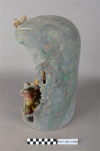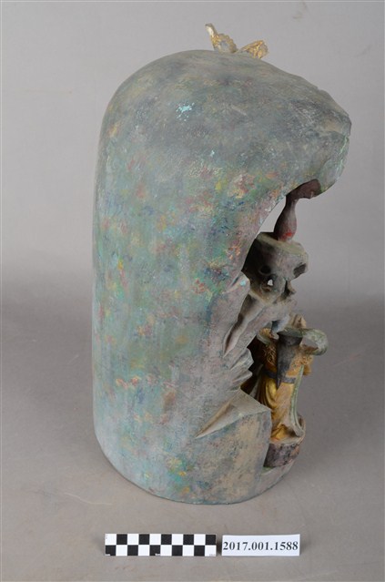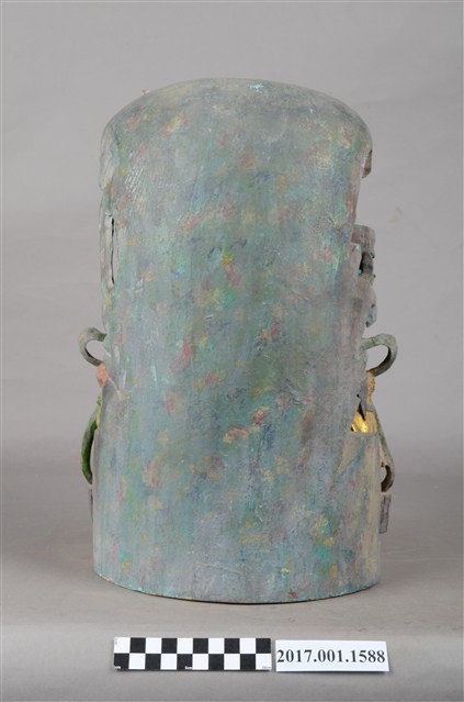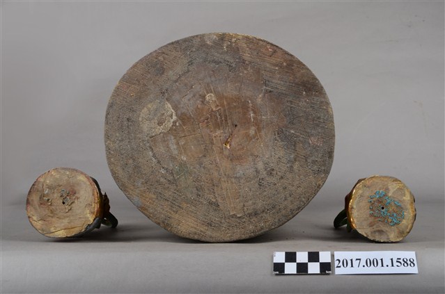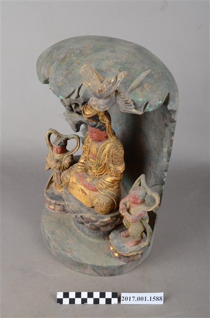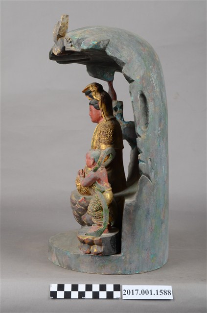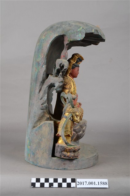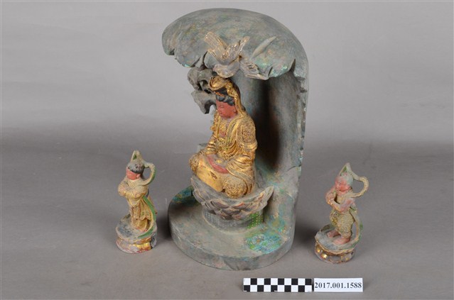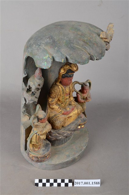 1.本件木雕觀世音菩薩像作觀世音菩薩與左右脅祀善財、龍女三像相連形式,三尊之臉部、肢體作紅色,衣袍以安金為主,衣面上有漆線粧佛。木雕三像連中央作一尊觀世音菩薩之像,菩薩作結跏趺坐姿態,盤坐於蓮座上,頭梳高髻,前方有一尊小化佛,披風帽,面相圓滿,身著開襟袍服,頸下掛有玉珮,雙手掌朝上交疊於腹前,結禪定印,左右分立善財、龍女,分別站立於蓮座上,可脫離蓮座,善財童子頭頂單半垂髫,著肚兜七分褲,雙手合十作朝拜狀,腳踝處戴腳環。龍女頭梳雙髻,身著長袍與過膝罩衫,雙手捧珠於胸前。兩神頭部後方皆有飄帶,下端垂於腳部兩側。菩薩身後岩屏上升成為寶蓋,左上方一隻展翅鸚鵡,身右小臺几上置一只淨瓶。