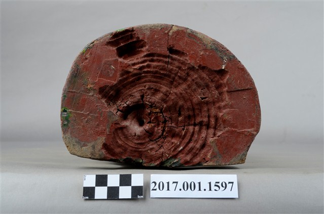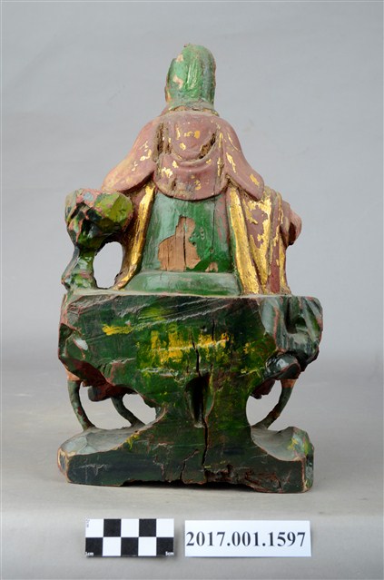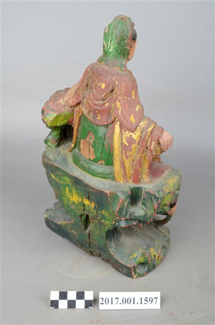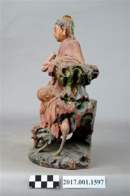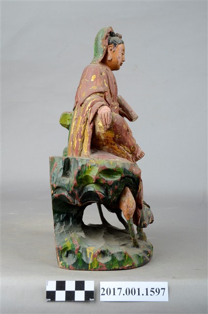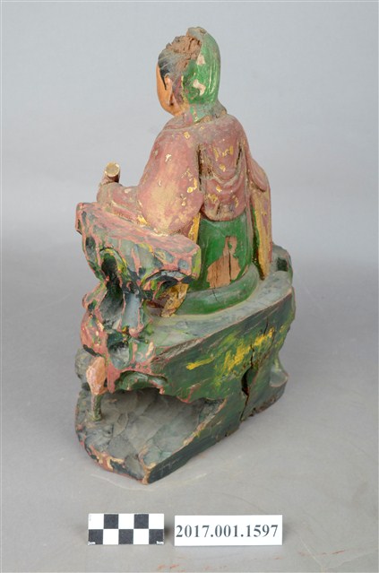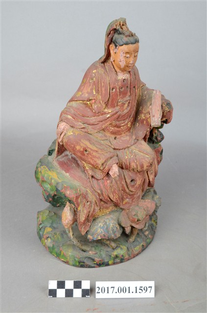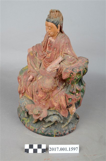 1.本件木雕觀世音菩薩像,作遊戲坐姿態,表面之安金已脫落,露出底下之絳紅色底,胸前、兩足與袍服下襬有蛀蝕孔,髮髻左側缺損。菩薩臉部圓潤,雙眼平視,頭頂梳高髻,身著開襟袍服,袍服之下襬順岩座下垂。左手倚於身左之岩石上持經卷,右手扶於右膝上,左腿內伸平坐,足部隱於右腿之後,右腿跣足,右膝朝向右上方。岩座下端中央作一株盛開蓮花、兩枝蓮葉,兩側各一朵含苞蓮花。