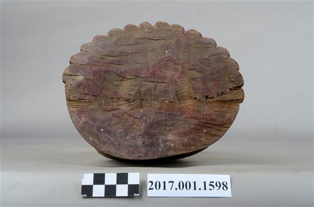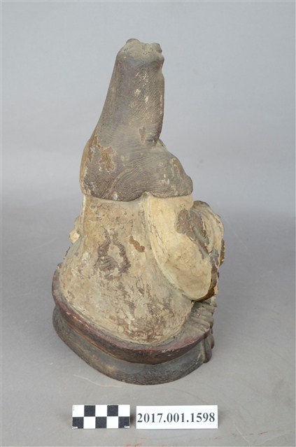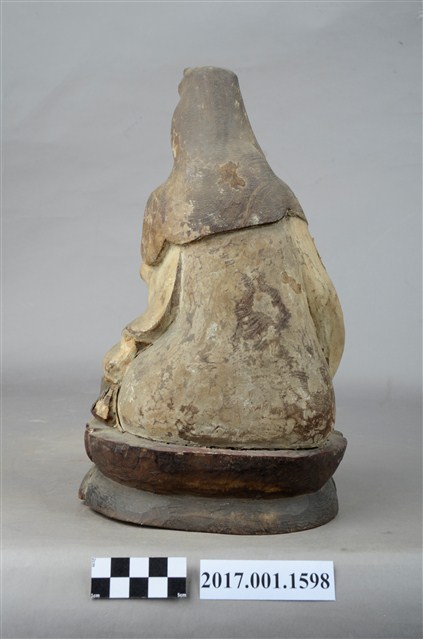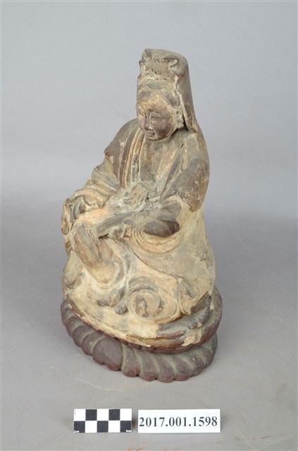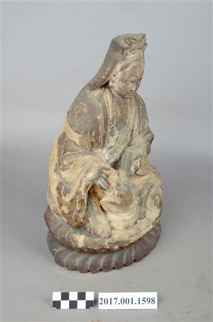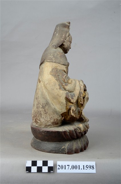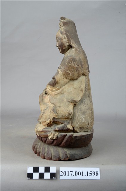1.本件木雕觀世音菩薩像,作遊戲坐姿態,表面之粧佛大面積已褪去並佈有污漬,蓮座上端前方缺損。菩薩身軀略向左傾,雙眼垂視,頭盤高髻披風帽,身著開襟袍服,袒胸,左手小臂橫於腹前,手掌朝上持經卷,右手扶於右膝上。左腿屈膝內伸,平坐於蓮座上,足部隱於右腿之後,右腿屈膝,膝蓋朝右上方,跣足,臺座作蓮花造形。