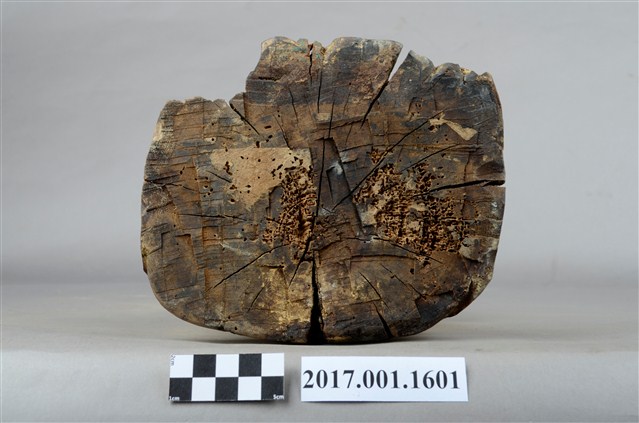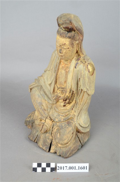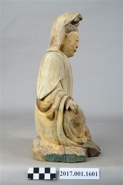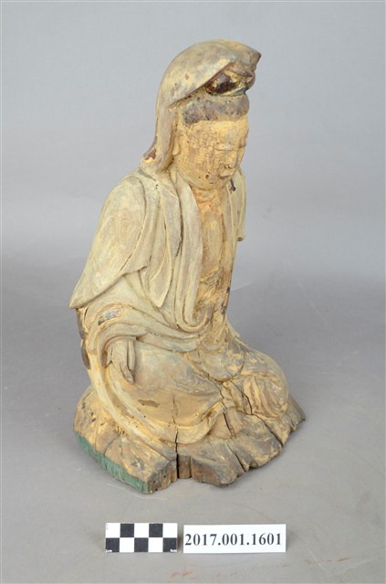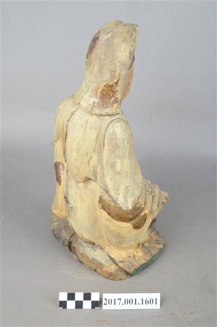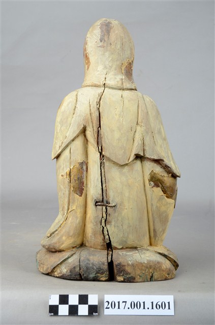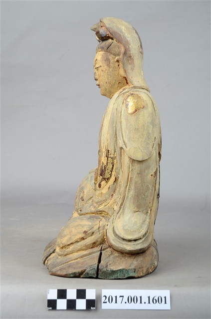 1.本件木雕觀世音菩薩像,作遊戲坐姿態,表面之粧佛已除去,身軀下端正面兩道裂紋,背後中央一道縱列紋自頸部延伸至臺座,臀部後方作一道金屬釘以收合。菩薩臉部修長,雙眼平視而帶笑意,頭盤高髻披風帽,身著開襟寬袖袍服、披肩,左腿屈膝平坐,足部置於右腿之後,右腿膝蓋朝上,跣足。右手扶於右膝上,左手朝下支撐於左膝後之臺座上。