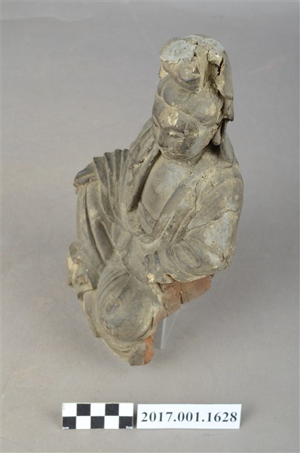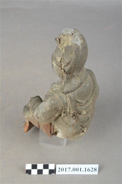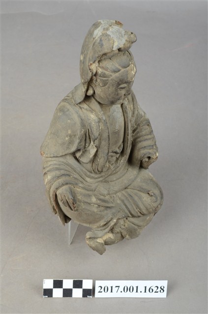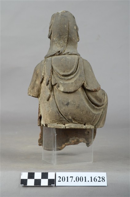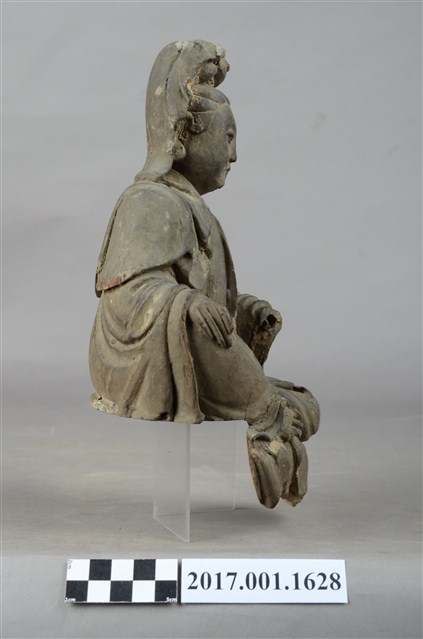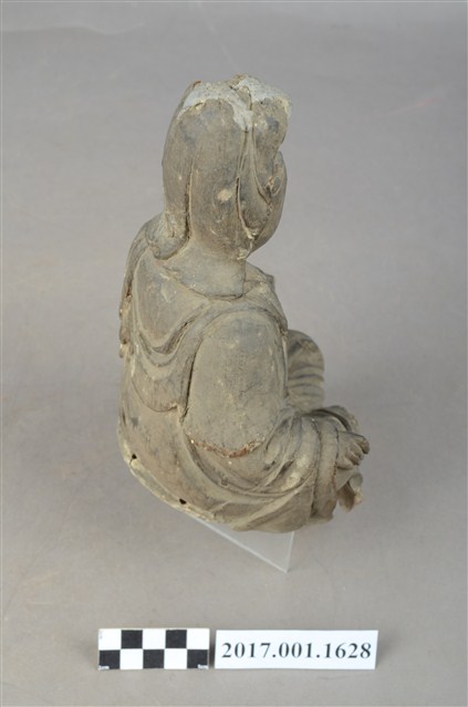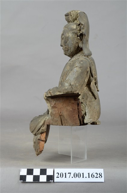 1.本件木雕觀世音菩薩像,作遊戲坐姿態,表面粧佛褪色並佈滿污漬,頭頂髮髻左方破損,臺座及身左之憑几缺失。菩薩臉型圓潤,雙眼平視,頭頂梳高髻披風帽,身著開襟袍服,袒胸,袍服之下襬垂於座前。左手小臂前伸,手掌自腕部缺損,右手扶於右膝上,左腿內伸平坐,足部隱於右腿之後,右腿跣足,右膝朝向右上方。
