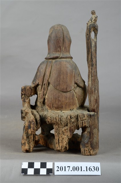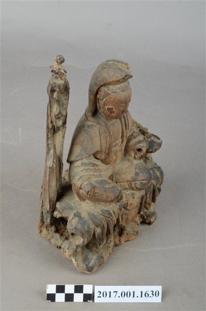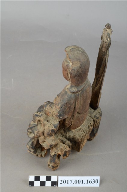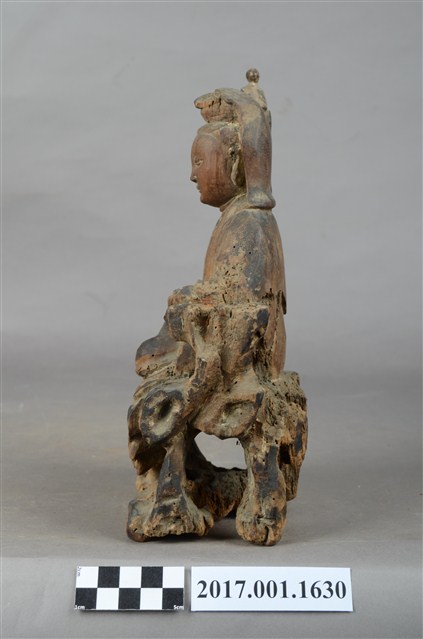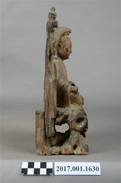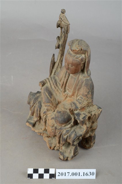 1.本件木雕觀世音菩薩像,作自在坐姿態,坐於岩座上,表面無法辨識粧佛作法。菩薩臉部呈橢圓形,顏面表現雙眼垂視,山根塌、鼻樑短,頦肌收縮凸起,髮梳高髻,頭披衣巾、戴冠,身著開襟袍服、披肩。右腿屈膝、左腿屈膝內伸,左手倚靠著岩石,右手放掌置於右膝上,雙手手掌缺失。岩座覆蓋坐布,坐布又稱座具,菩薩右側雕塑石柱,柱上有鸚鵡,典故是出自《鸚哥寶卷》。