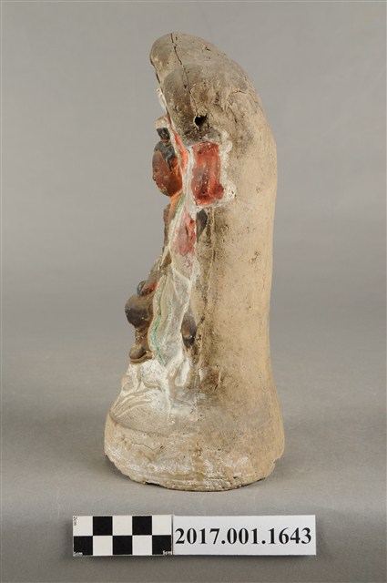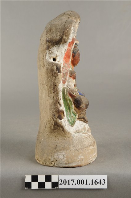 1.本件泥塑觀世音菩薩像,作自在坐姿態,坐於岩座上,身後有延伸至頭頂之岩石寶蓋,為普陀巖觀世音菩薩造形,表面施作塗裝粧佛技法,粧佛局部剝落。菩薩臉部呈橢圓形,顏面表現雙眼垂視,山根塌、鼻樑短,髮梳高髻,頭披衣巾,身著開襟袍服、披肩,頸部佩戴瓔珞。右腿屈膝、左腿屈膝內伸,左手持書卷置於左膝,右手抱著小孩,小孩坐於右膝上。岩座前下方泥塑一朵盛開的蓮花,兩側各有花苞與蓮藕。