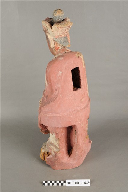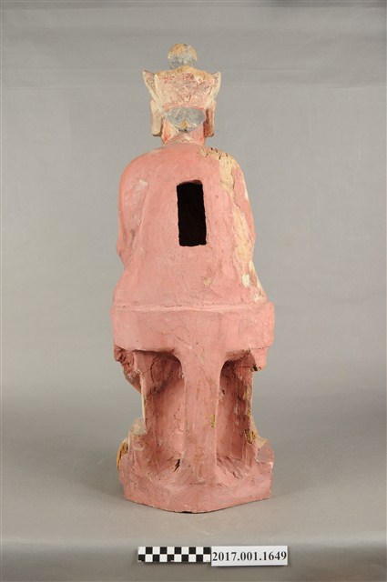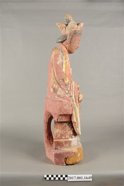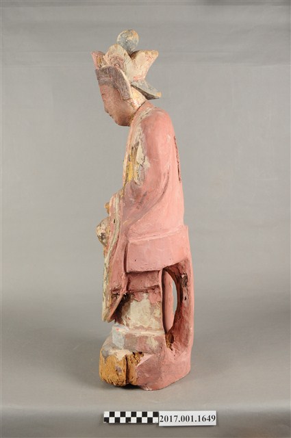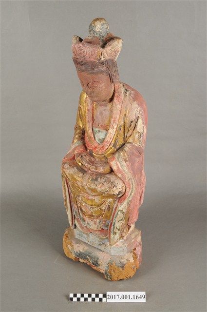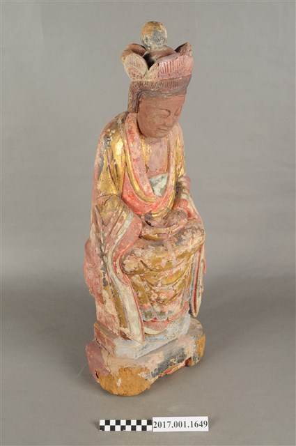 1.本件木雕觀世音菩薩像,作結跏趺坐姿態,坐於金剛座上,表面施作塗裝、安金不見紅粧佛技法,局部粧佛剝落,背部開有長方形入神洞,內容物件已取出。菩薩臉部呈橢圓形,顏面表現雙眼垂視,山根塌、鼻樑短,頦肌收縮凸起,造像於腦後梳髮髻,頭戴五佛冠,身著開襟袍服、披肩。雙足盤腿,雙手相疊成禪定印置於腹前。