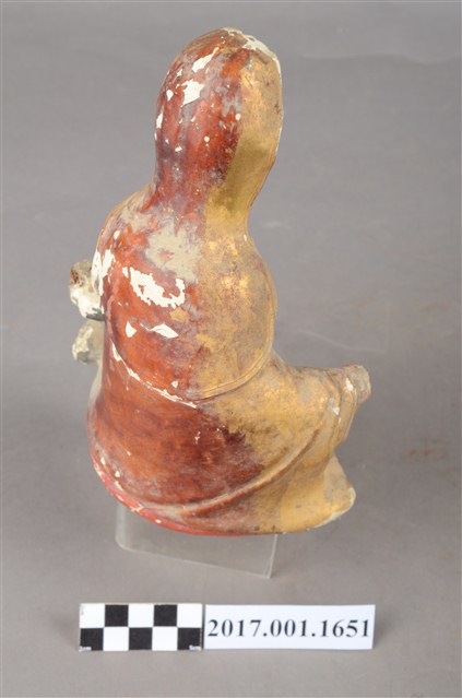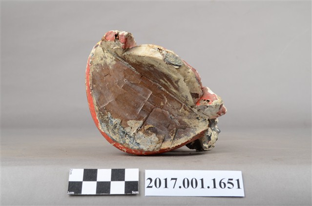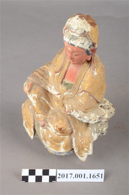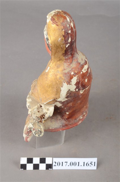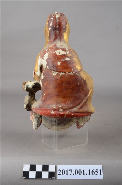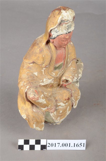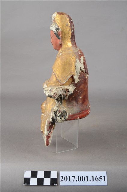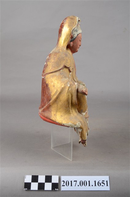 1.本件木雕觀世音菩薩像,作自在坐姿態,表面施作塗裝、安金不見紅漆線盤飾粧佛技法,粧佛局部剝落。菩薩臉部呈橢圓形,顏面表現雙眼垂視,山根塌、鼻樑短,頦肌收縮凸起,髮梳高髻,頭披衣巾、戴冠,匠師墨線勾勒五官細節,頸部佩戴項鍊,身著開襟袍服、披肩。右腿屈膝、左腿屈膝內伸,左手靠著岩石上,左手掌缺失,右手放掌置於右膝上。本件屬於「脫椅」作法,岩座已缺失。