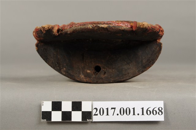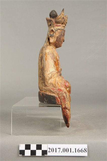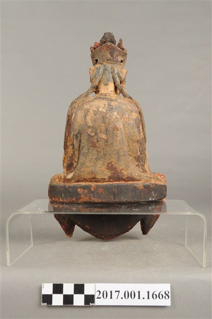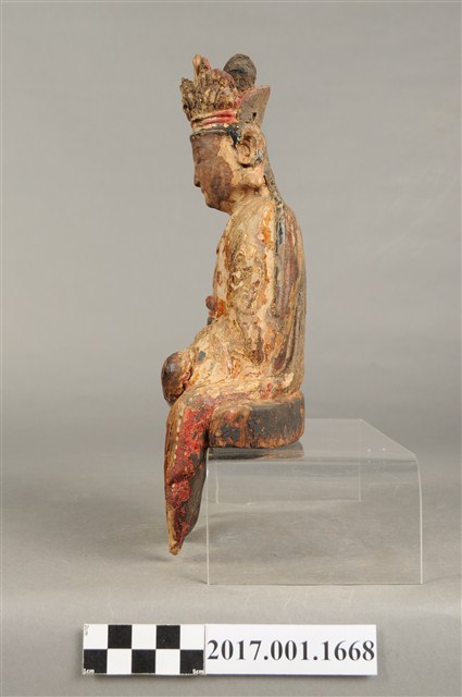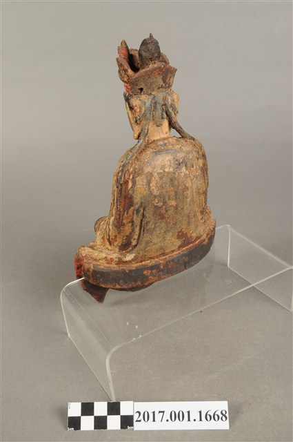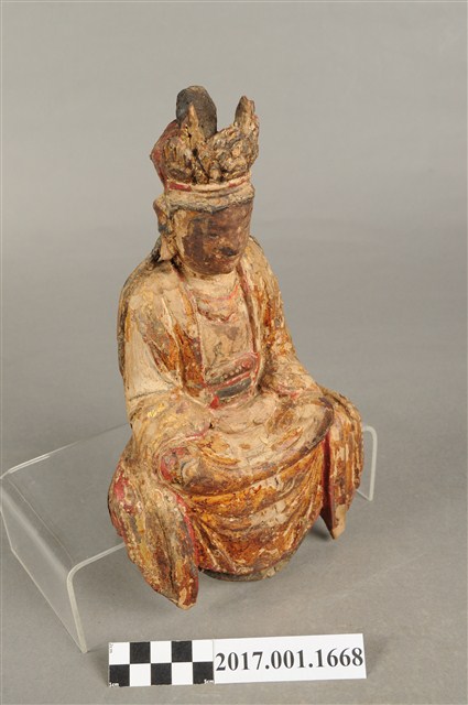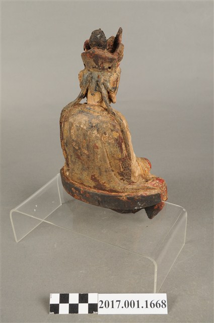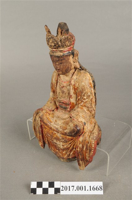 1.本件木雕觀世音菩薩像,作結跏趺坐姿態,表面施作塗裝、安金不見紅粧佛技法,粧佛局部剝落。菩薩臉部呈橢圓形,顏面表現山根塌、鼻樑短,頦肌收縮凸起,眉毛與眼珠、鼻子以彩繪表現,頭戴毘盧冠,冠上雕刻化佛,毘盧冠後的兩道劍帶擺放於肩上,身著開襟袍服、披肩,頸部佩戴瓔珞。雙足盤腿,雙手相疊成禪定印置於腹前。本件屬於「脫椅」作法,臺座缺失。