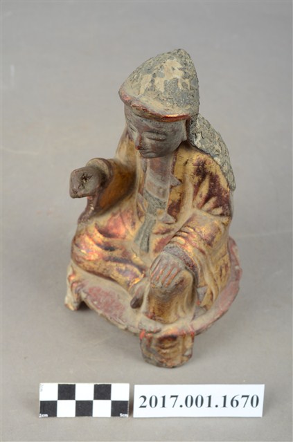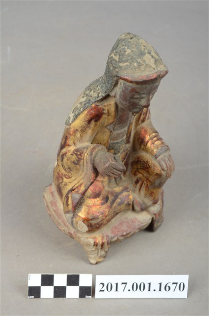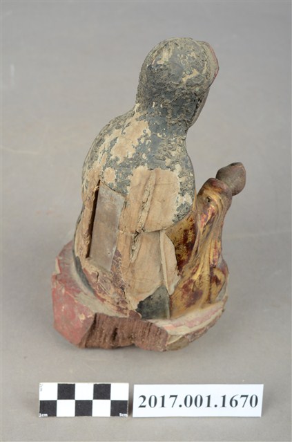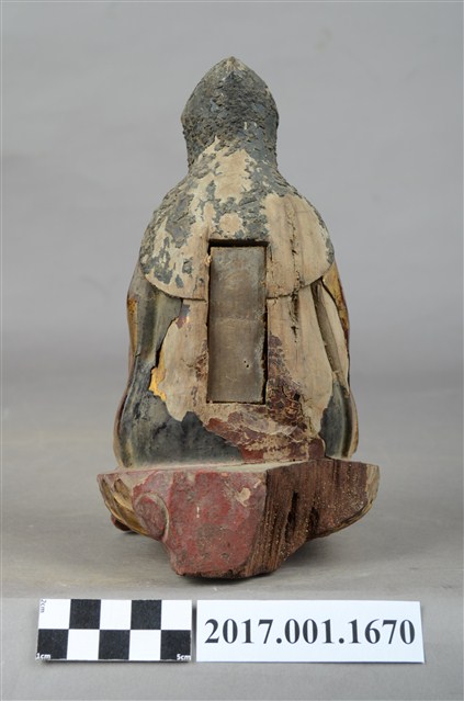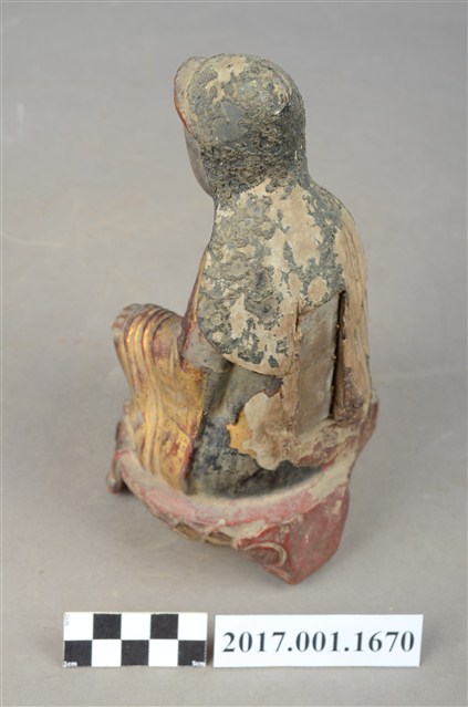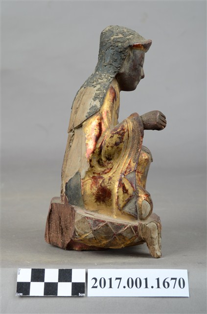 1.本件木雕觀世音菩薩像,作自在坐姿態,坐於蓮座上,表面施作塗裝、安金不見紅漆線盤飾粧佛技法,粧佛局部剝落,背面開有長方形入神洞,封榫尚存。菩薩臉部呈橢圓形,顏面表現山根塌、鼻樑短,頦肌收縮凸起,髮梳高髻,頭披衣巾、戴化佛冠,身著開襟袍服、披肩。左腿屈膝、右腿屈膝內伸,左手放掌置於左膝上,右手高舉成舉物狀。蓮座為仰蓮式。