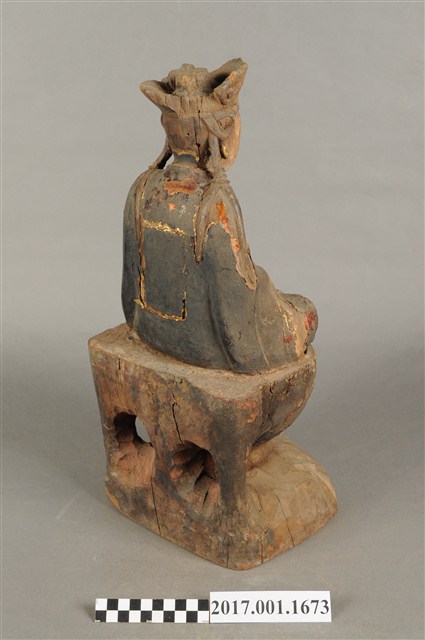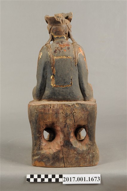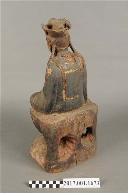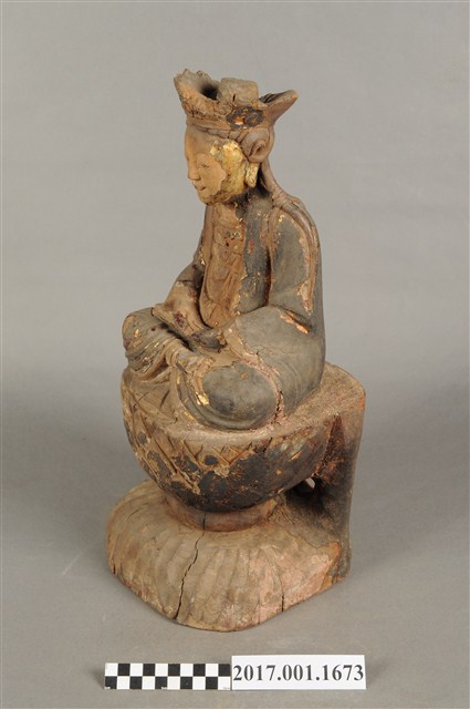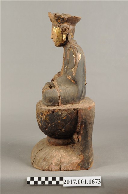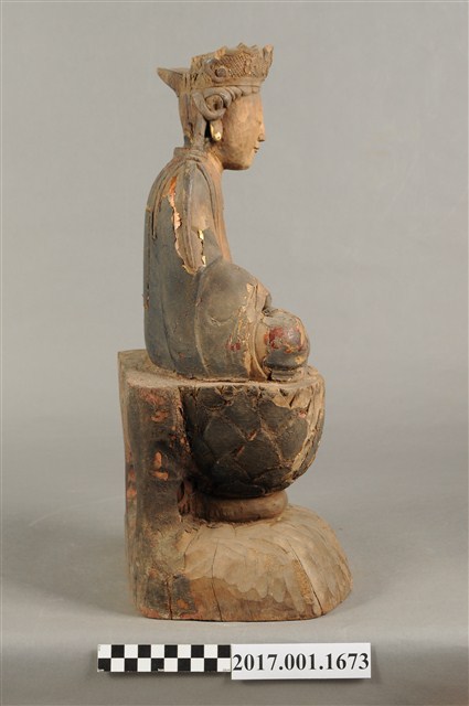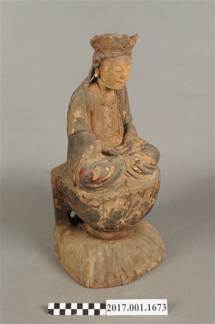 1.本件木雕觀世音菩薩像,作結跏趺坐姿態,坐於蓮座上,表面施作塗裝、安金不見紅粧佛技法,粧佛剝落嚴重,背面開有長方形入神洞,封榫尚存。菩薩臉部呈橢圓形,顏面表現雙眼垂視,山根塌、鼻樑短,頦肌收縮凸起,頭戴毘盧冠,冠面雕刻化佛,兩道髮辮擺放於肩上,身著開襟袍服、披肩,頸部佩戴瓔珞。雙足盤腿,雙掌相疊成禪定印置於腹前。蓮座為仰蓮式。