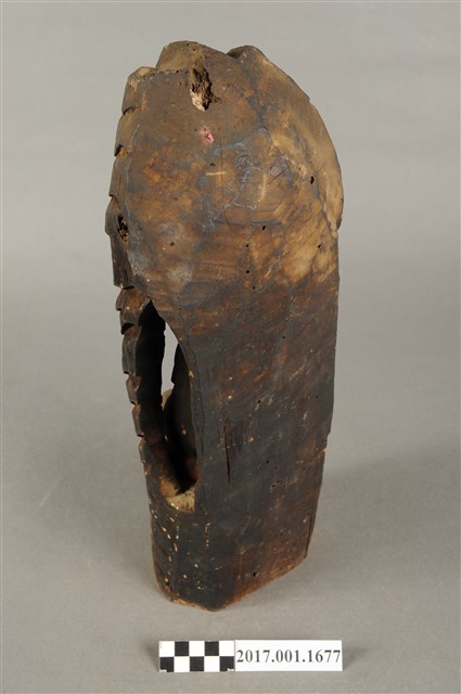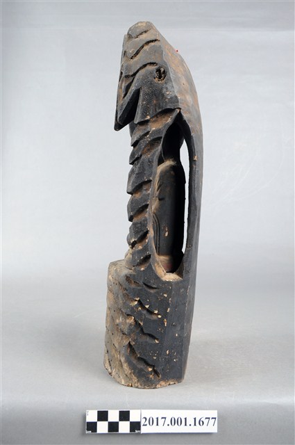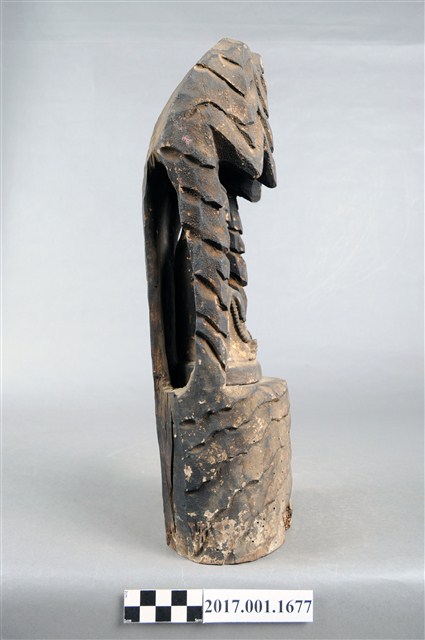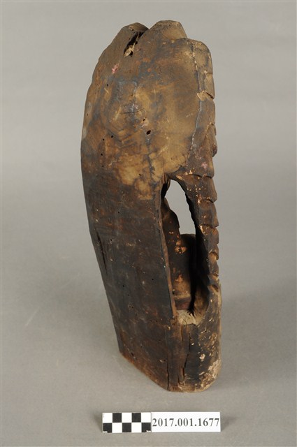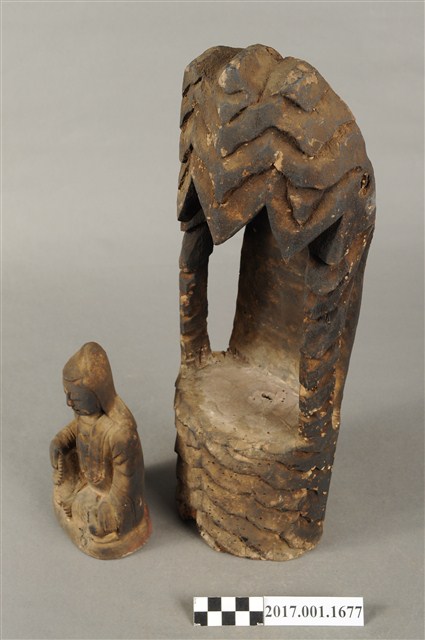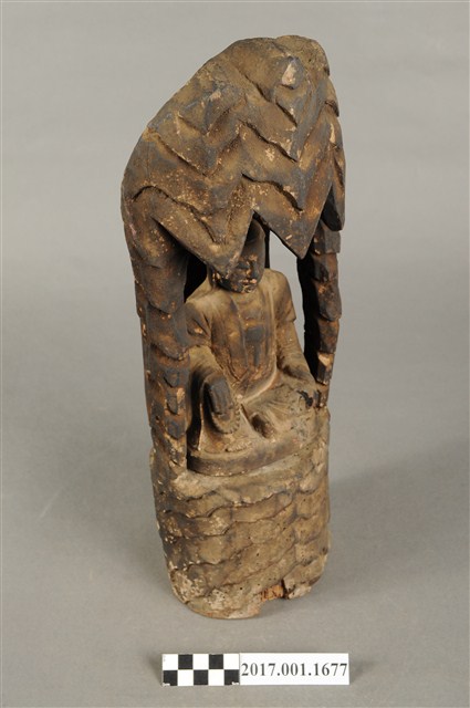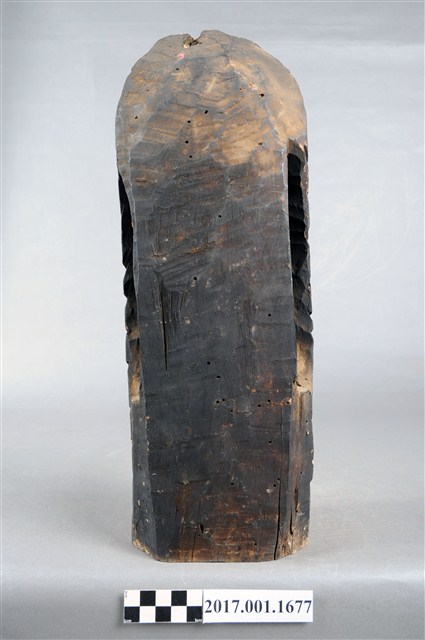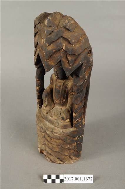 1.本件木雕觀世音菩薩像,作自在坐姿態,表面施作塗裝粧佛技法,背面開有長方形入神洞,封榫佚失,入神物尚存。菩薩臉部呈橢圓形,顏面表現雙目緊閉,山根塌、鼻樑短,頦肌收縮凸起,頭披衣巾,身著開襟袍服、披肩,坐於臺座上。右腿屈膝、左腿屈膝內伸,左手放掌置於左膝,右手放掌持念珠置於右膝。本件造像分為觀世音菩薩像、普陀巖,兩部分,觀世音菩薩像可擺放入普陀巖內,普陀巖雕刻鋸齒狀模仿岩石紋路。