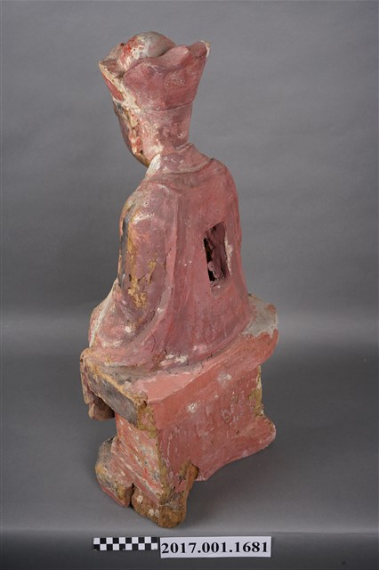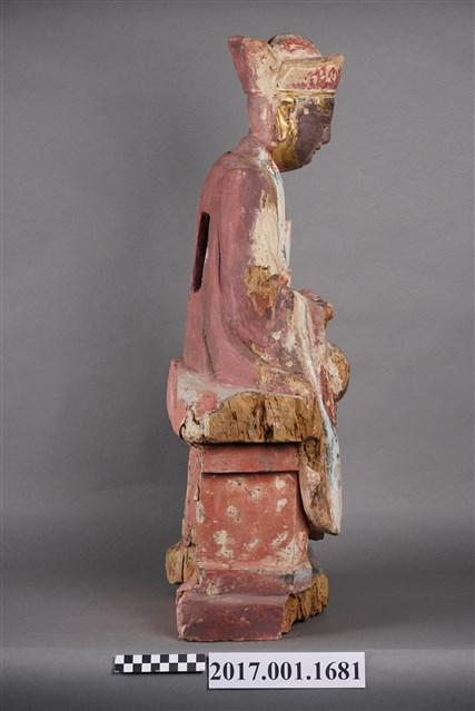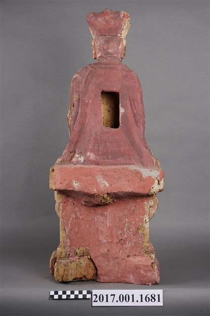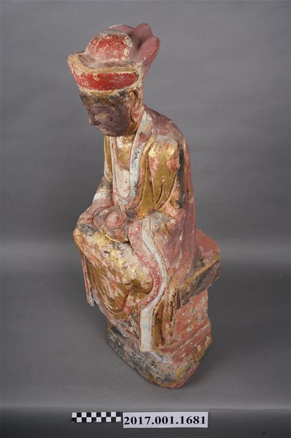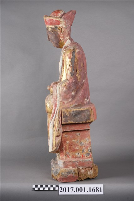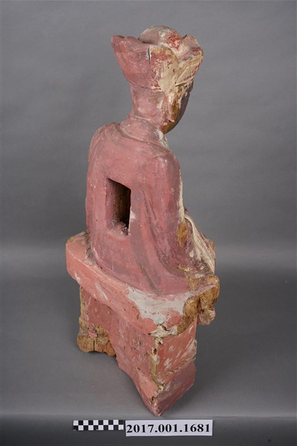 1.本件木雕觀世音菩薩像,作結跏趺坐姿態,坐於金剛座上,表面施作塗裝、安金不見紅粧佛技法,粧佛局部剝落,背面開有長方形入神洞,封榫佚失,內容物件已取出。菩薩臉部呈橢圓形,顏面表現雙眼垂視,山根塌、鼻樑短,頦肌收縮凸起,頭戴毘盧冠,身著開襟袍服、披肩。雙足盤腿,雙掌相疊成禪定印置於腹前捧摩尼珠。
