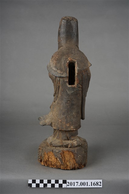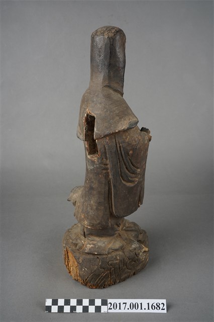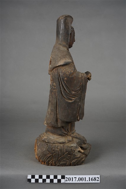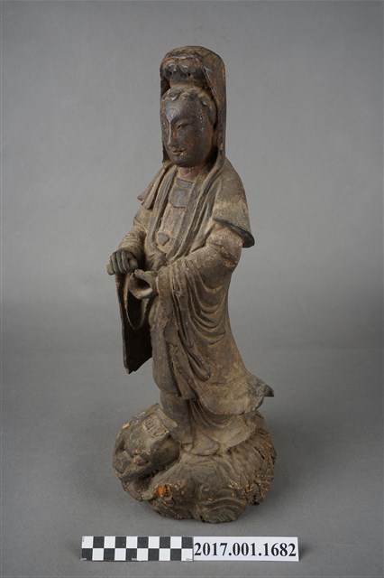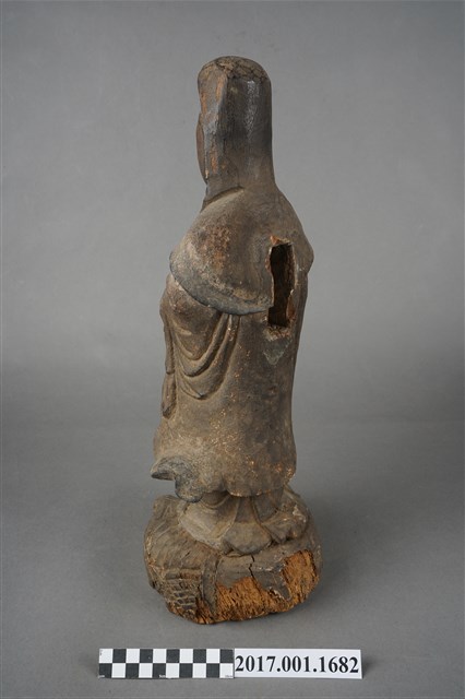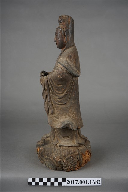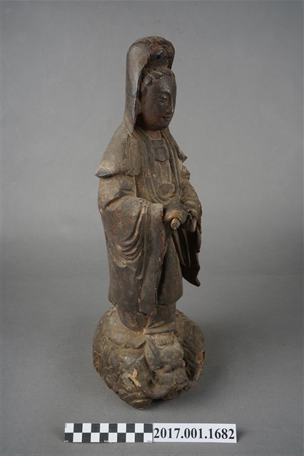 1.本件木雕觀世音菩薩像,作立姿姿態,表面施作塗裝粧佛技法,背面開有長方形入神洞,封榫佚失,內容物件已取出。菩薩臉部呈橢圓形,顏面表現雙眼垂視,山根塌、鼻樑短,頦肌收縮凸起,髮梳高髻,頭披衣巾、戴化佛冠,身著開襟袍服、披肩,頸部佩戴瓔珞。立像挺身跣足以雙足丁字步的姿態站於龍上。左腳踏在龍頭,左手成持物狀置於腹前,持物缺失,右手持書卷置於腹前。
