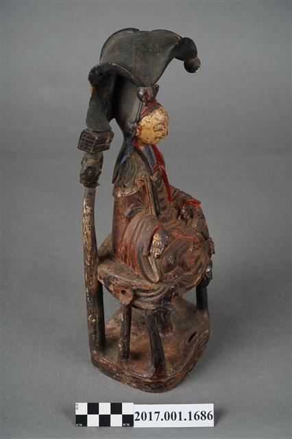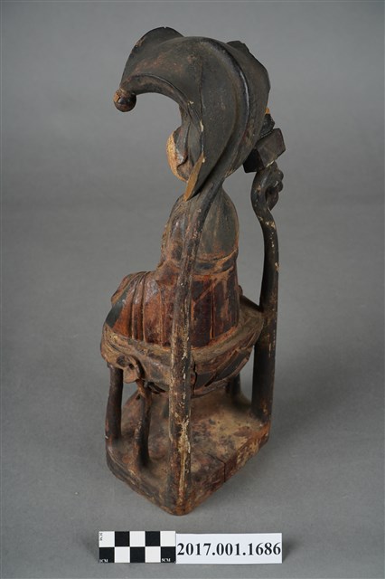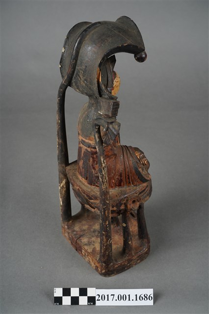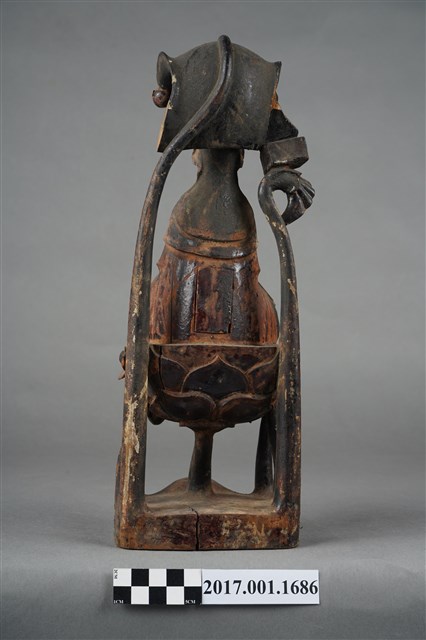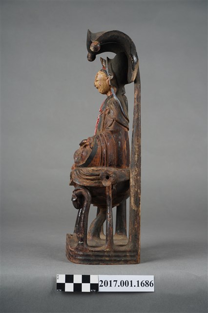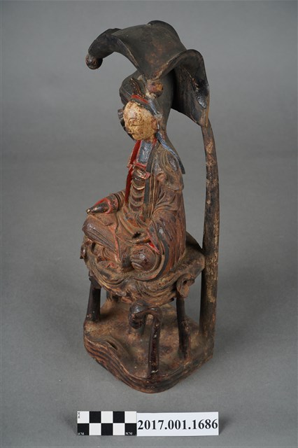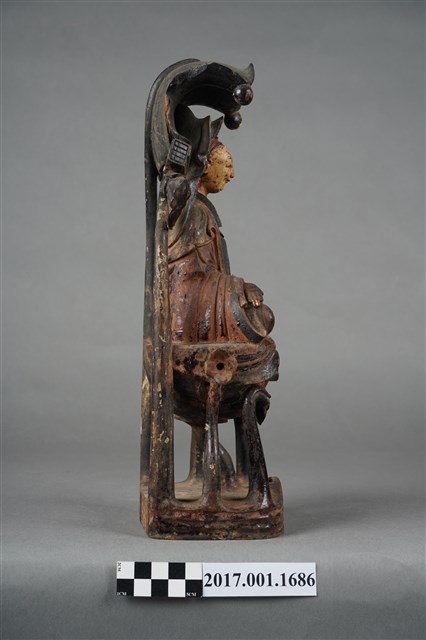 1.本件木雕觀世音菩薩像,作結跏趺坐姿態,坐於蓮座上,表面施作塗裝粧佛技法,局部漆面剝落,背面開有長方形入神洞,內容物件尚未取出。菩薩臉部呈橢圓形,顏面表現山根塌、鼻樑短,頦肌收縮凸起,頭披衣巾,戴化佛冠,冠面雕刻化佛,身著開襟袍服、披肩。雙足盤腿,左手伸收中指與無名指伸三指,右手放掌置於右膝。蓮座為仰蓮式,蓮座下有花莖,蓮座前下方雕塑四支花苞支撐起蓮座,下有臺座表現海浪。造像右後方有蓮葉於造像的頭部上方展開,左後方有蓮藕向上托著書函。