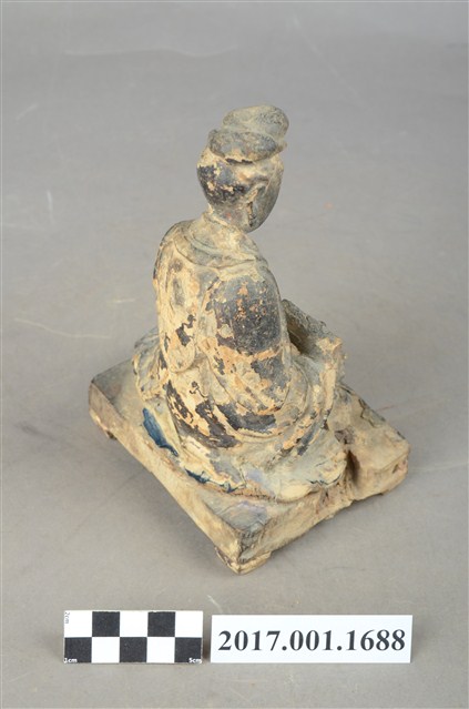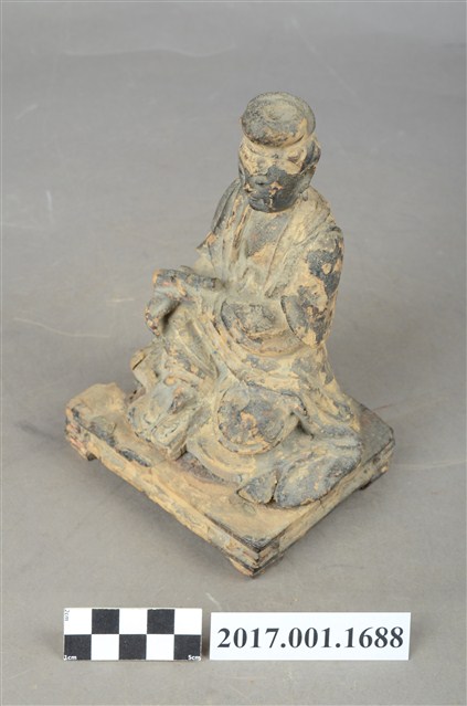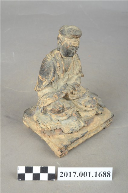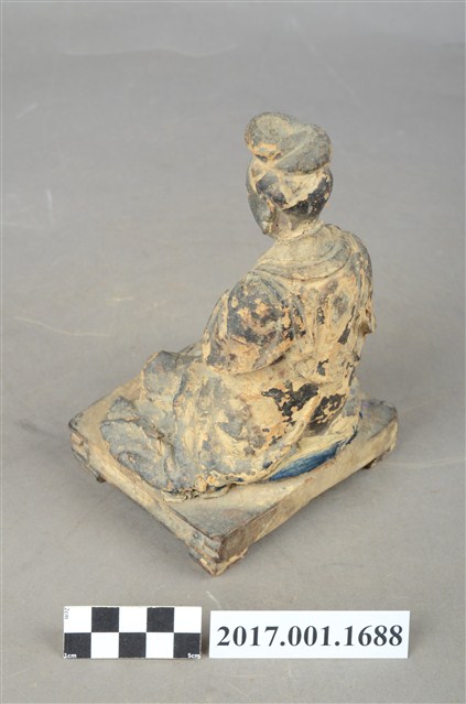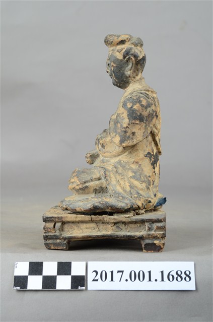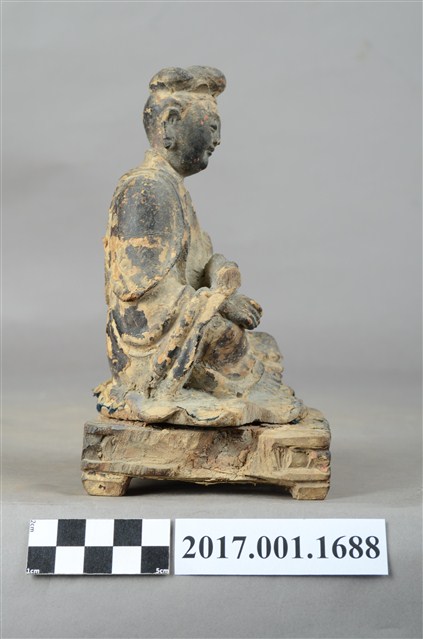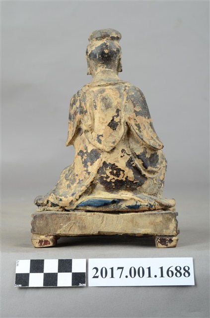 1.本件木雕觀世音菩薩像,作自在坐姿態,坐於臺座上,表面施作塗裝粧佛技法,局部漆面剝落。臉部呈橢圓形,顏面表現山根塌、鼻樑短,頦肌收縮凸起,頭梳高髻,身著開襟袍服、披肩。右腿屈膝,左腿屈膝內伸,左手持書卷橫置於右胸前,右手放掌置於右膝。