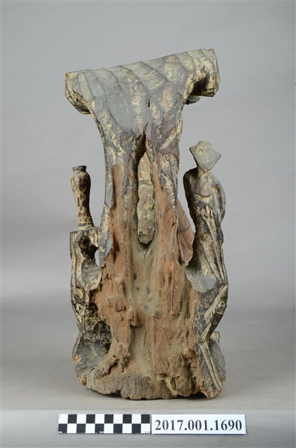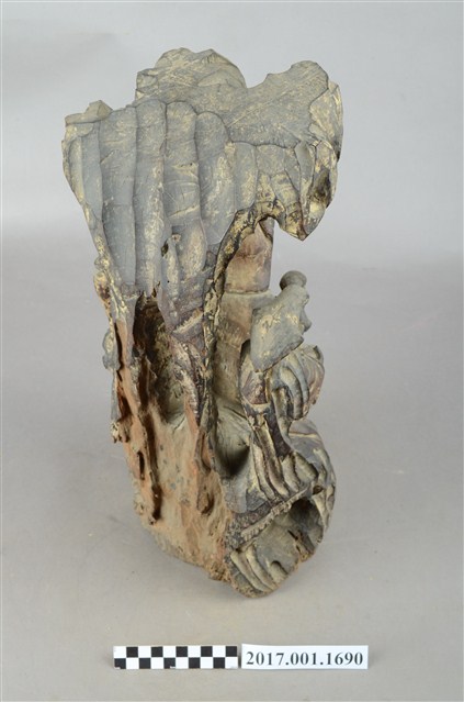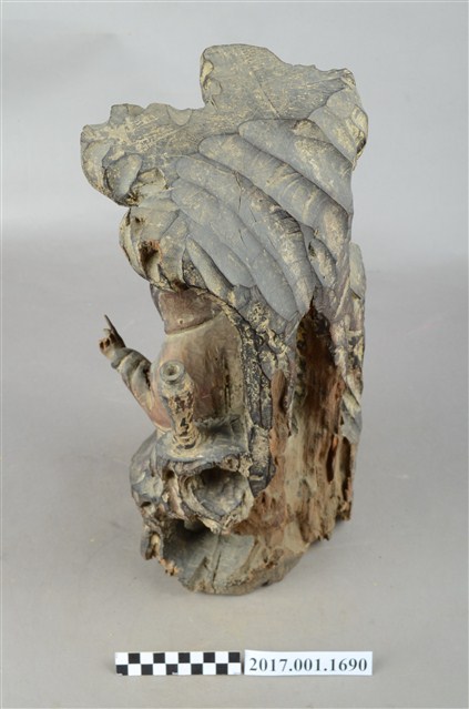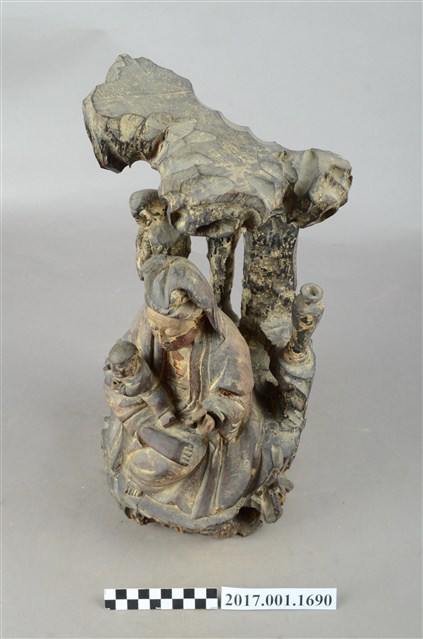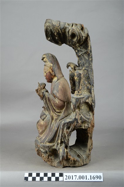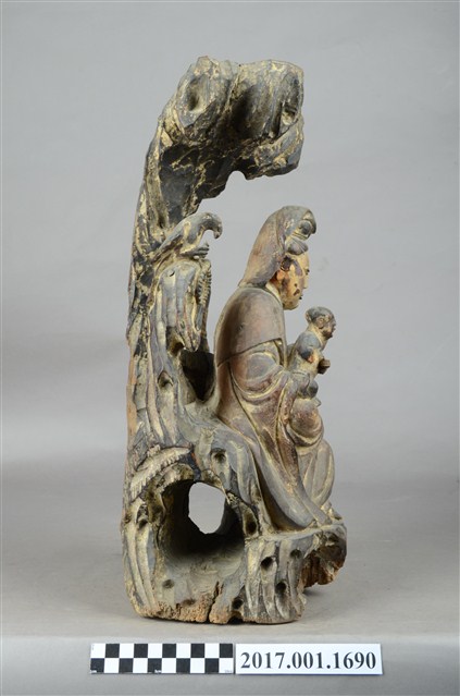 1.本件木雕觀世音菩薩像,作遊戲坐姿態,坐於岩座上,身後有延伸至頭頂之岩石寶蓋,為普陀巖觀世音菩薩造形,表面施作塗裝粧佛技法,局部漆面剝落。菩薩臉部呈橢圓形,顏面表現雙眼垂視,山根塌、鼻樑短,頦肌收縮凸起,頭披衣巾,身著開襟袍服、披肩。左腿垂下、右腿屈膝內伸,左手高舉伸食指收四指,右手扶著幼童。菩薩身後左側石柱上置淨瓶、右側石柱上有鸚鵡,鸚鵡啣著念珠。幼童無髮,上半身著窄袖衫、下半身著褲,腳套著舄。