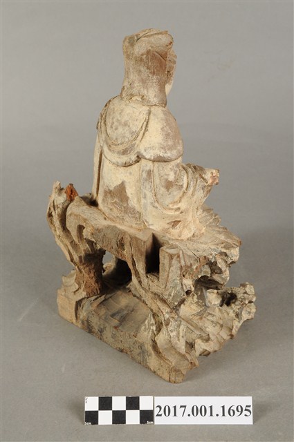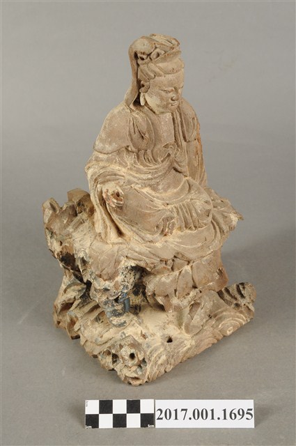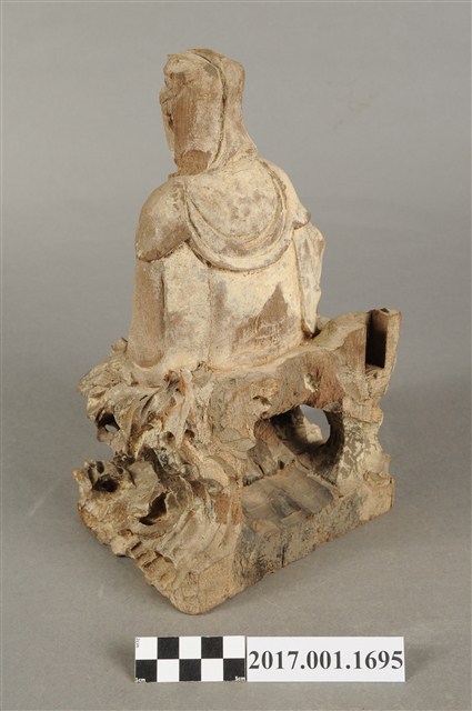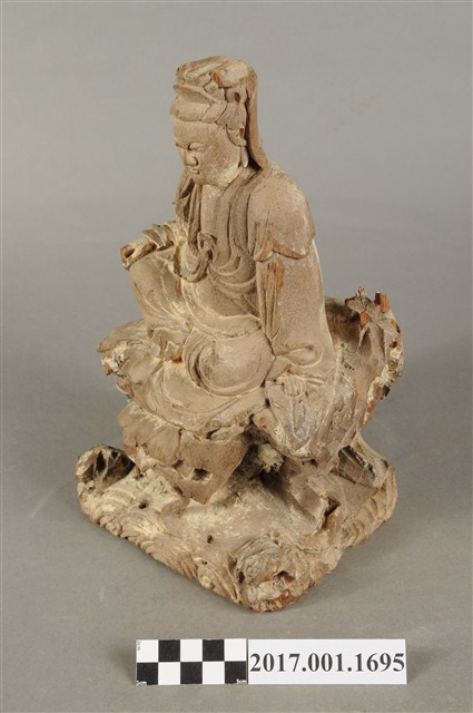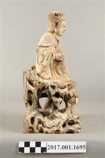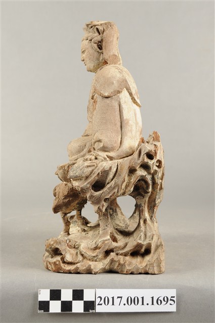 1.本件木雕觀世音菩薩像,作自在坐姿態,坐於岩座上,表面粧佛已褪去。菩薩臉部呈橢圓形,顏面表現雙眼垂視,山根塌、鼻樑短,頦肌收縮凸起,頭梳高髻,披衣巾,戴化佛冠,身著開襟袍服、披肩。右腿屈膝、左腿屈膝內伸,左手放掌向下,右手握拳置於右膝上。岩座下有一朵盛開的蓮花與一片蓮葉從海浪中長出。