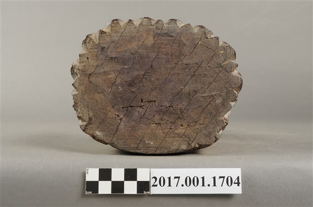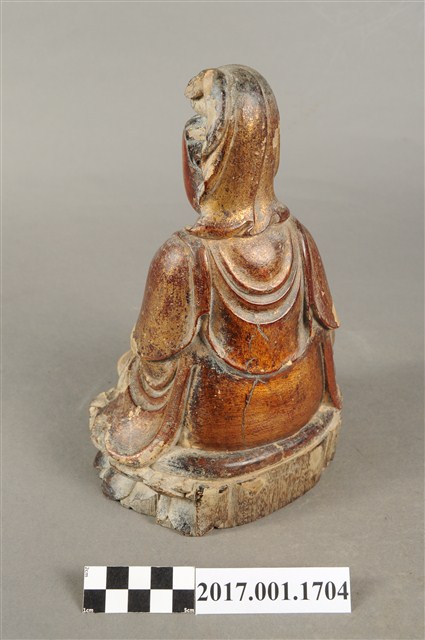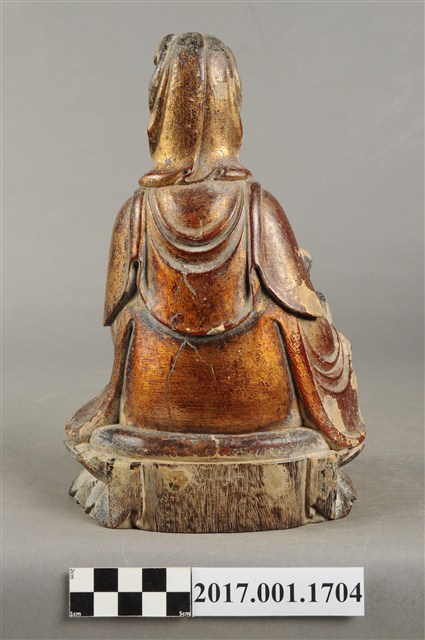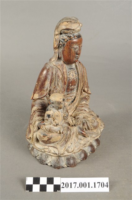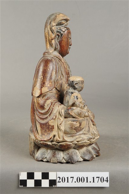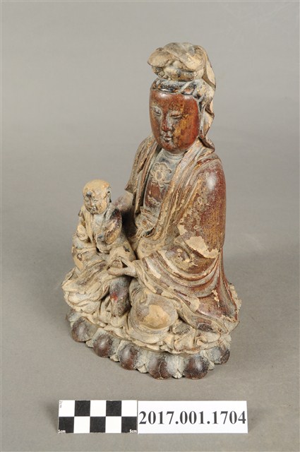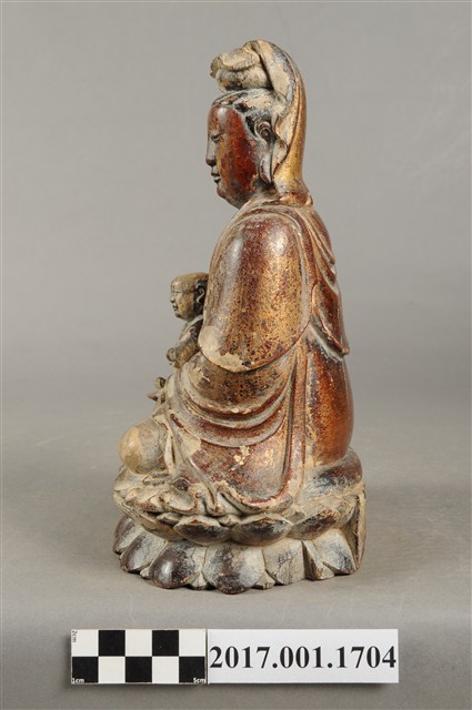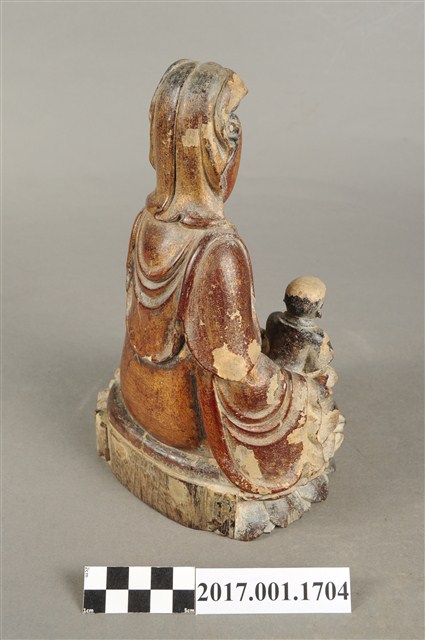1.本件木雕觀世音菩薩像,作單跏趺坐姿態,表面施作塗裝、安金不見紅粧佛技法,粧佛剝落嚴重。菩薩臉部呈橢圓形,顏面表現雙眼垂視,山根塌、鼻樑短,頦肌收縮凸起,髮梳高髻,頭披衣巾,髮髻綴著髮飾,身著開襟袍服、披肩,頸部佩戴瓔珞。雙足盤腿,右手捧著男孩的右膝,左手捧著男孩的左腳。男孩頭無髮,右手持元寶、左手掌缺失,上半身著罩衫、下半身穿開襠褲、腳套舄。