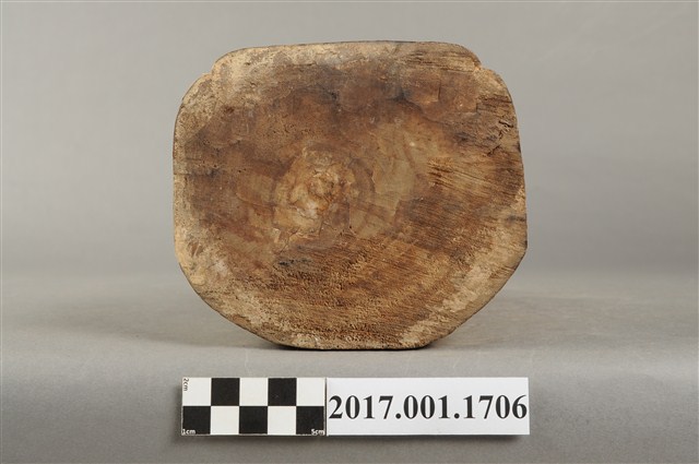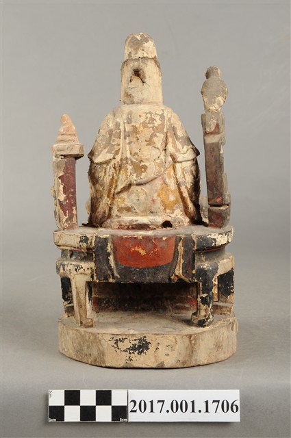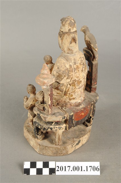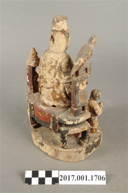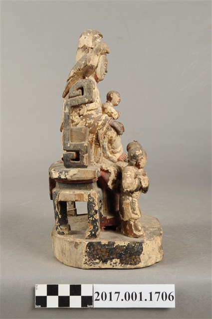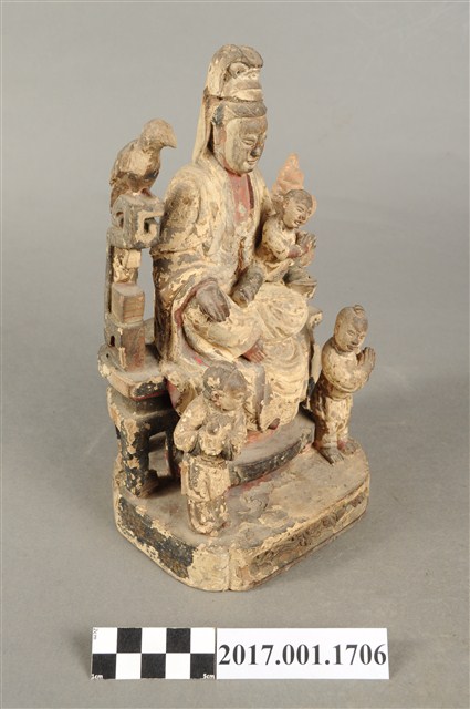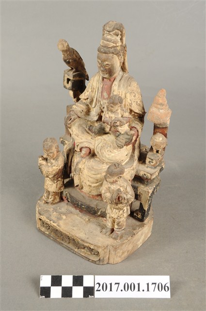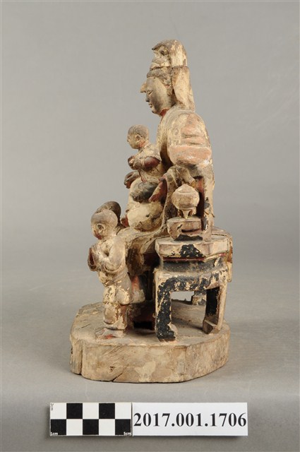 1.本件木雕觀世音菩薩像,作自在坐姿態,坐在椅凳上,表面施作塗裝、安金不見紅粉線盤飾粧佛技法,粧佛剝落嚴重。菩薩臉部呈橢圓形,顏面表現雙眼垂視,山根塌、鼻樑短,頦肌收縮凸起,髮梳高髻,頭披衣巾,戴冠,身著開襟袍服、披肩。右腿屈膝、左腿屈膝內伸,左手抱著男孩,右手放掌置於右膝。椅凳披著坐布,坐布又稱座具,椅後雕刻博古架,左側博古架放置香爐、葫蘆,右側博古架放置書函、鸚鵡,椅凳前設置踏几。踏几兩側分立善財、龍女,善財頭頂梳雙髻,頭微微右傾,雙手合掌橫置於左胸前,跣足挺身立於臺座上,龍女頭梳雙髻,頭微微左傾,雙手捧珠橫置於右胸前,腳套舄挺身立於臺座上。臺座於正面淺浮雕花鳥紋飾。