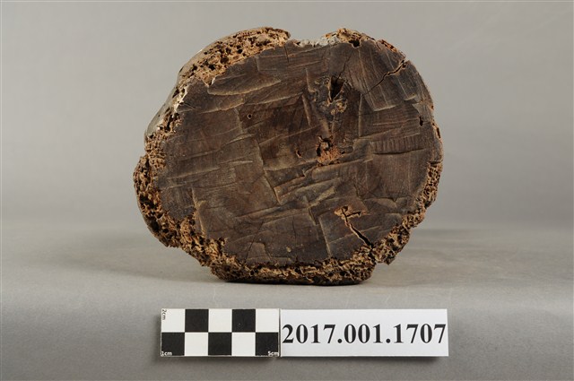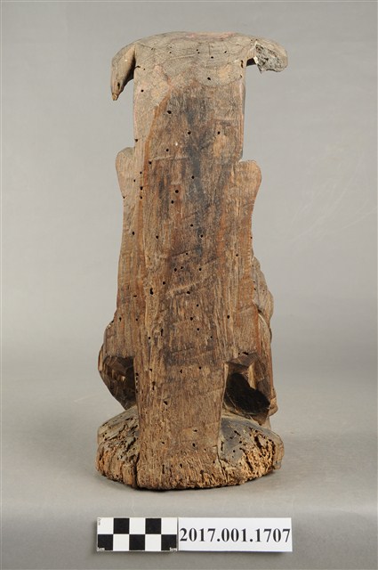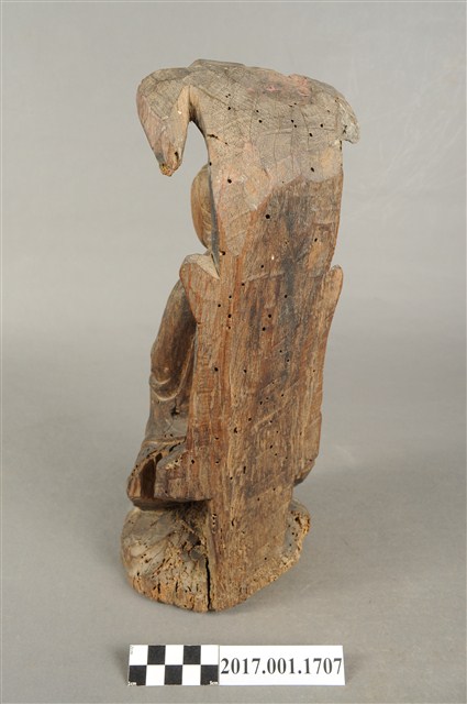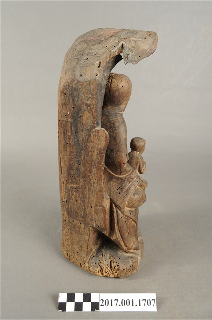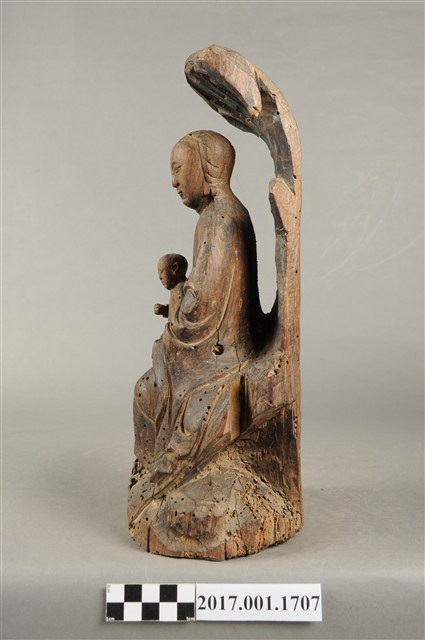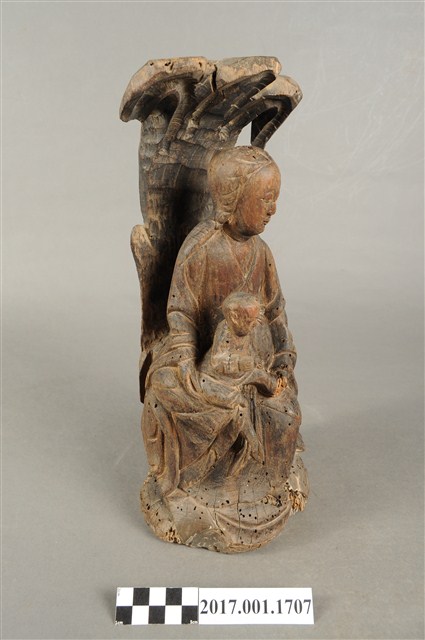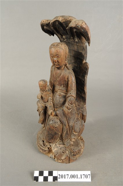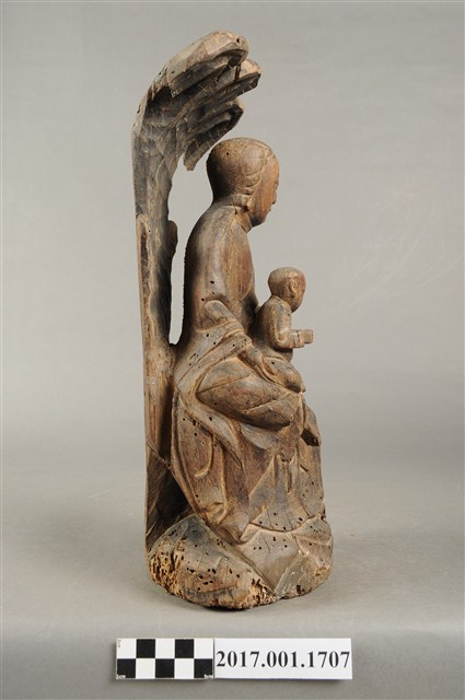 1.本件木雕觀世音菩薩像,作遊戲坐姿態,坐於岩座上,身後有延伸之至頭頂之岩石寶蓋,為普陀巖觀世音菩薩造形,粧佛已除去。菩薩臉呈橢圓形,顏面表現雙眼垂視,山根塌、鼻樑短,頦肌收縮凸起,髮梳辮子,兩道髮辮擺放於肩上,頭微微向左轉,上半身穿右衽寬袖衣、下身著裳。左腿垂下、右腿屈膝內伸,右手捧著男孩、左手扶著男孩的左腳。