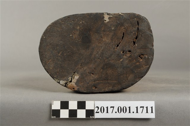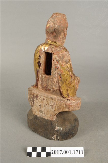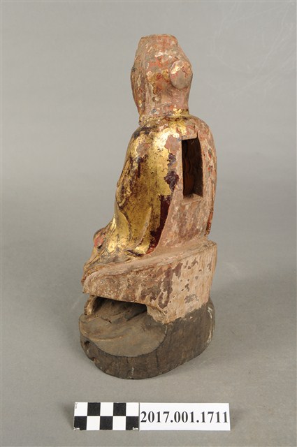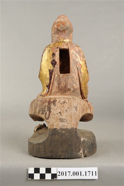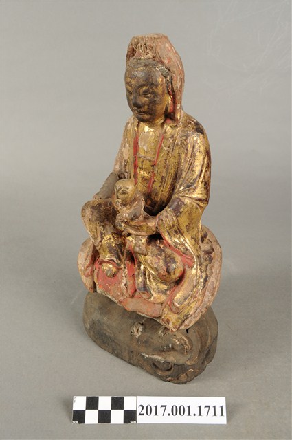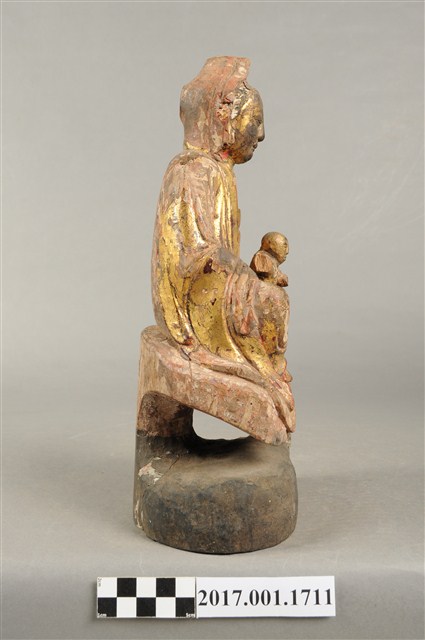 1.本件木雕觀世音菩薩像,作自在坐姿態,表面施作塗裝、安金不見紅粉線盤飾粧佛技法,粧佛局部剝落,背面開有長方形入神洞,封榫佚失,內容物件已取出。菩薩臉部呈橢圓形,顏面表現雙眼垂視,鼻子的鼻眉肌與皺眉肌相連,山根塌、鼻樑短,頦肌收縮凸起。頭披衣巾,戴化佛冠,冠面雕刻化佛,肩披雲肩,身著飄繙。右腿屈膝、左腿屈膝內伸,左手抱著男孩、右手放掌置於右膝。男孩無髮,男孩體態左腳伸直,右足半趺坐在菩薩左腳上。