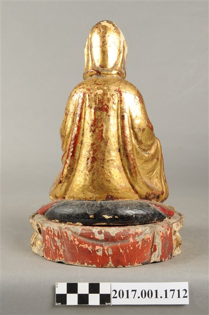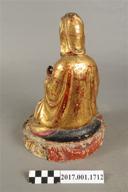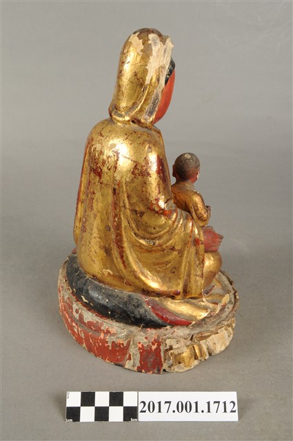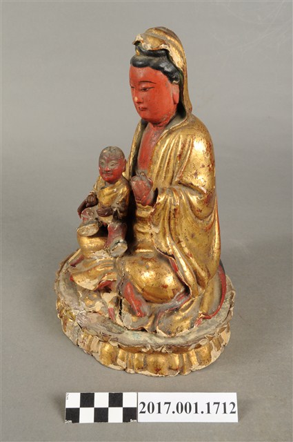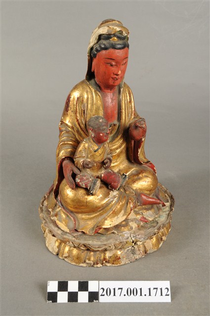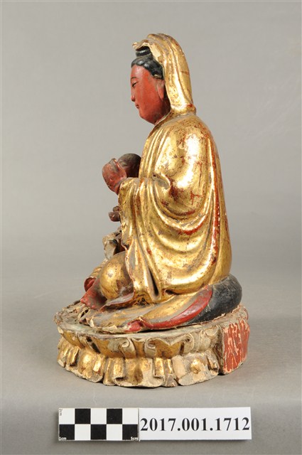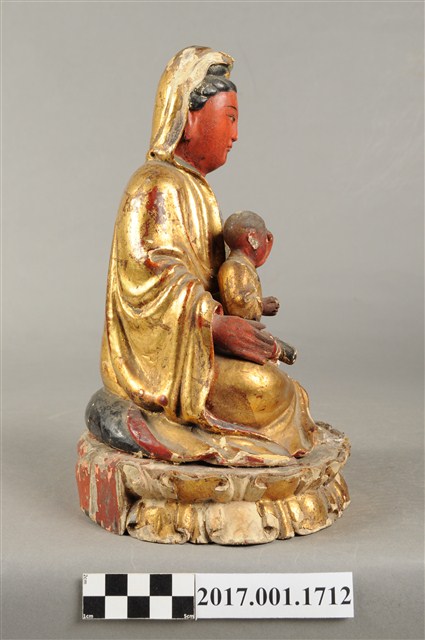 1.本件木雕觀世音菩薩像,作單跏趺坐姿態,坐於蓮座上,表面施作塗裝、安金不見紅粧佛技。菩薩臉部呈橢圓形,顏面表現雙眼垂視,鼻子的鼻眉肌與皺眉肌相連,山根塌、鼻樑短,頦肌收縮凸起。髮梳高髻,頭披衣巾,髮髻綴著髮飾,身著開襟袍服、披肩。雙足盤腿,右手扶著男孩的右膝,左手舉起成持物狀。蓮座為束腰仰覆蓮式,仰蓮的蓮花瓣向外捲曲。男孩頭微微向左轉,無髮,上半身著右衽窄袖衫、下半身穿褲、腳套舄,體態左腳伸直、右腳盤起,左手放掌、右手握拳。