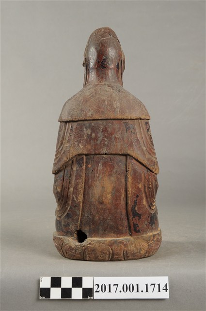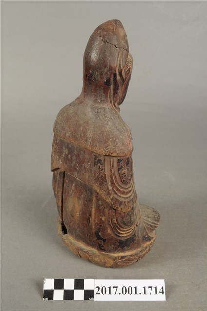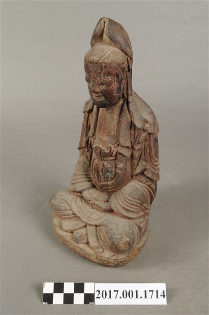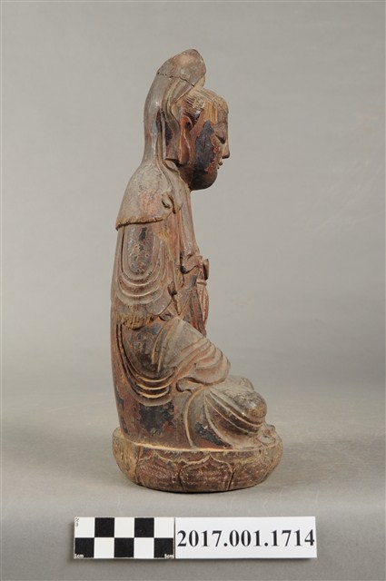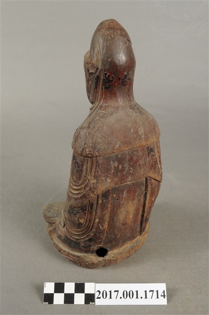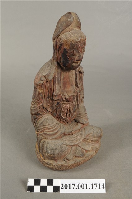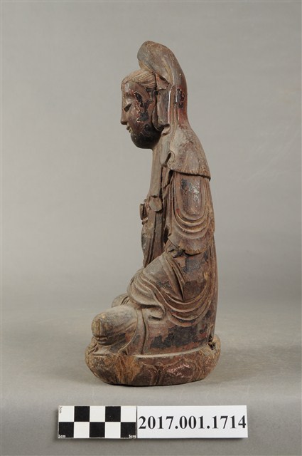 1.本件木雕觀世音菩薩像,作結跏趺坐姿態,坐於蓮座上,表面施作塗裝粧佛技法。菩薩臉部呈橢圓形,顏面表現雙眼垂視,山根塌、鼻樑短,頦肌收縮凸起,髮梳高髻,頭披衣巾,身著開襟袍服、披肩。雙足盤腿,雙手相疊成禪定印置於腹前。蓮座為仰蓮式。