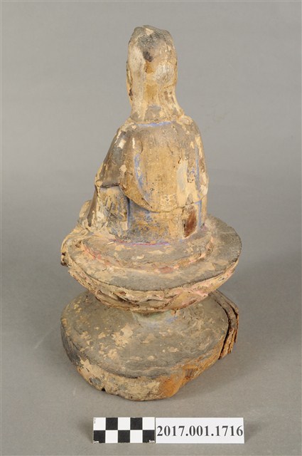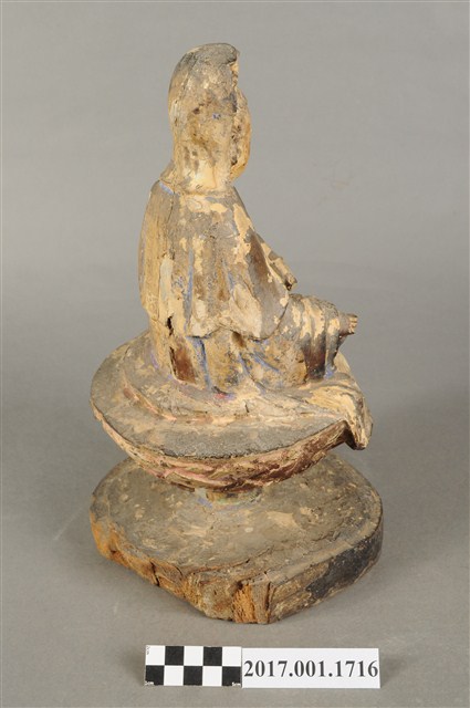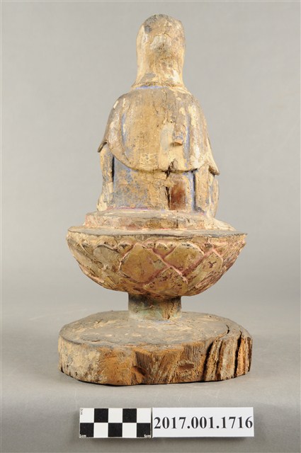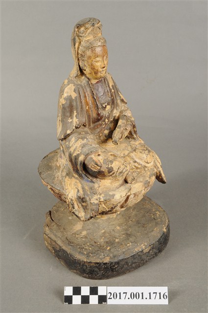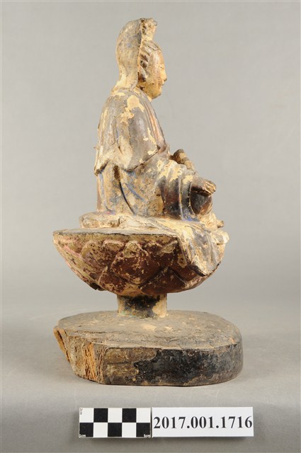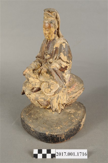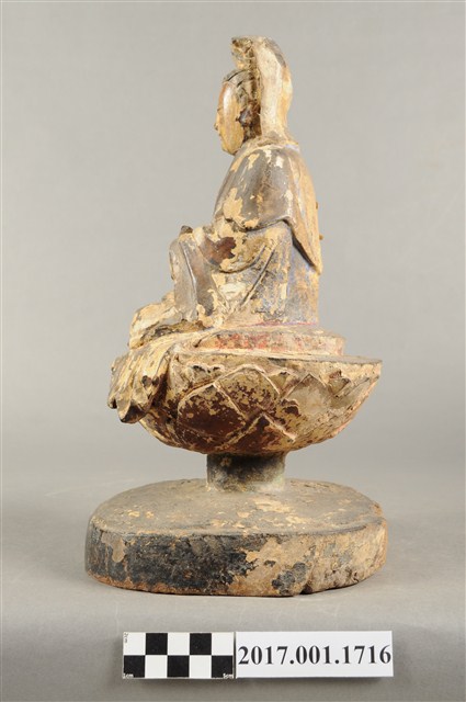 1.本件木雕觀世音菩薩像,作自在坐姿態,坐於蓮座上,表面施作塗裝、安金不見紅粧佛技法,粧佛局部剝落。菩薩臉呈橢圓形,顏面表現雙眼垂視,山根塌、鼻樑短,頦肌收縮凸起,髮梳高髻,頭披衣巾、戴冠,身著開襟袍服、披肩,頸部佩戴瓔珞。右腿屈膝、左腿屈膝內伸,左手持書卷,右手放掌置於右膝上。蓮座為仰蓮式,蓮座與臺座之間有花莖。