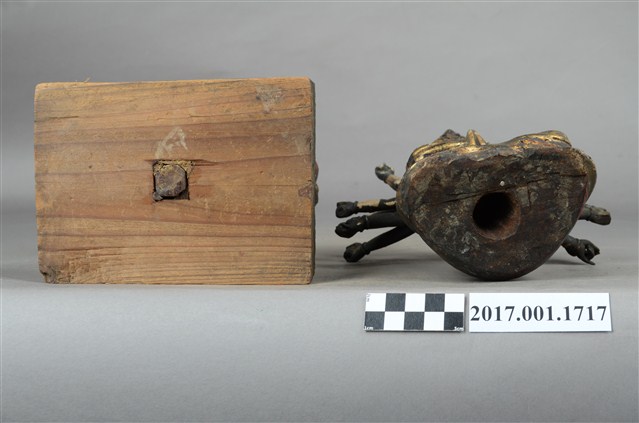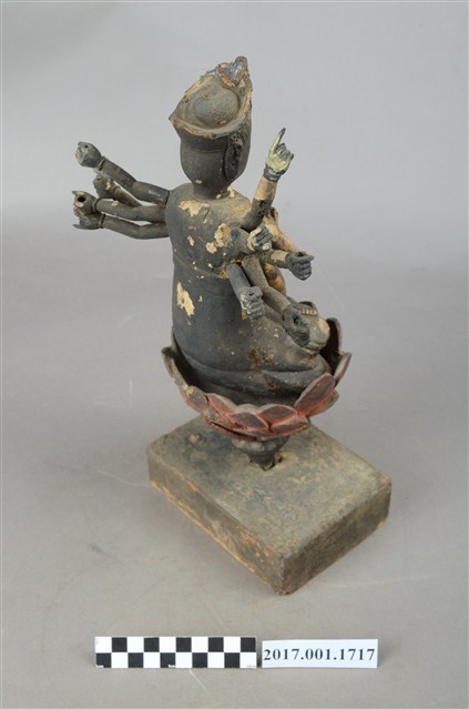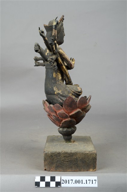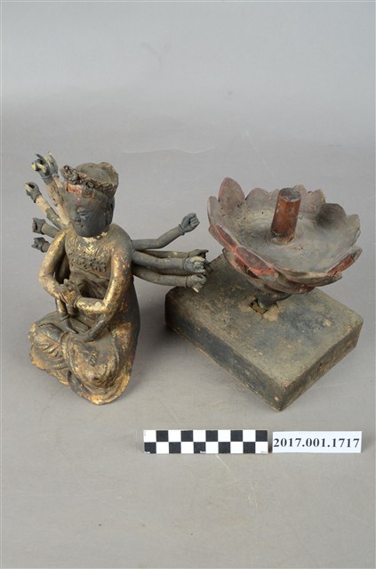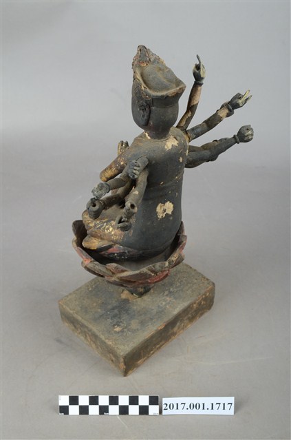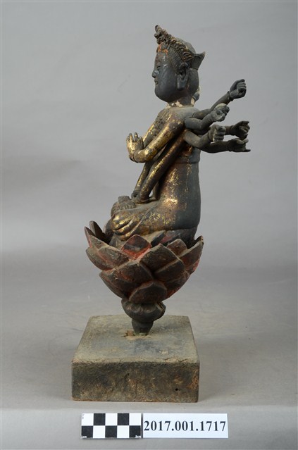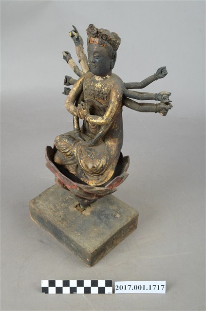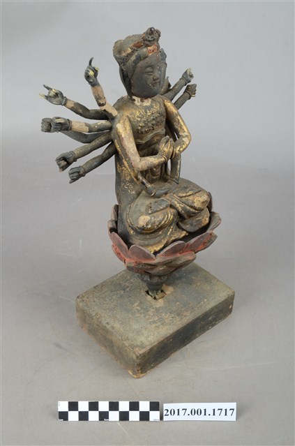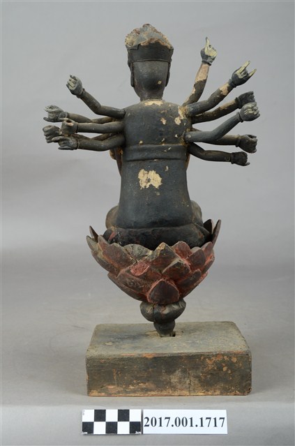 1.本件木雕準提觀世音菩薩像,作結跏趺坐姿態,坐於蓮座上,表面施作塗裝、安金不見紅粧佛技法,粧佛剝落嚴重。菩薩臉呈橢圓形,顏面表現雙眼垂視,山根塌、鼻樑短,頦肌收縮凸起,髮梳高髻,頭戴冠,冠面雕刻化佛,身著開襟袍服,頸部佩戴瓔珞。雙足盤腿,而左腳在上又稱為「降魔坐」,本件原有十八手,今尚有十五手,每隻手皆佩帶手釧,左右手合掌置於胸前,下二手相疊成禪定印置於腹前,背後雙手交錯,沒有持物。蓮座為仰蓮式,菩薩與蓮座、臺座可拆解。