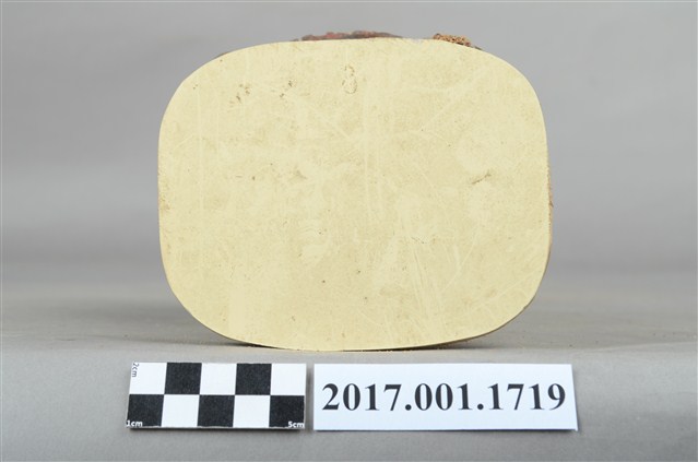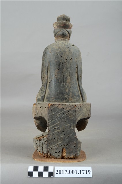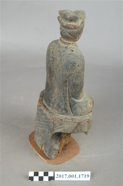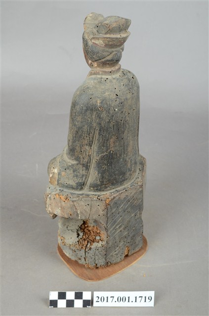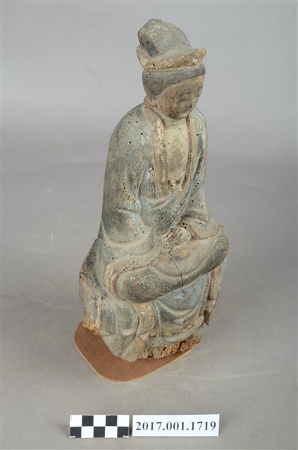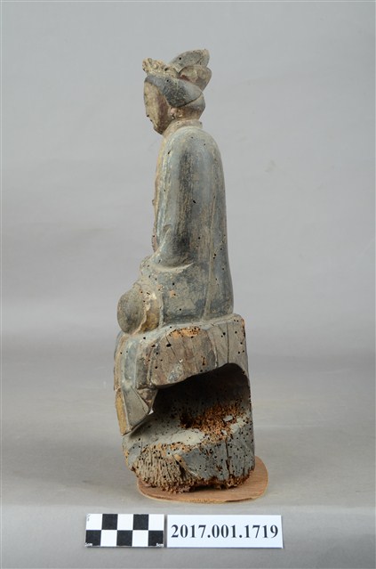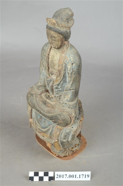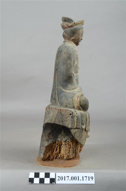 1.本件木雕觀世音菩薩像,作結跏趺坐姿態,坐在臺座上,表面施作塗裝粧佛技法,局部漆面剝落。菩薩臉呈圓形,顏面表現雙目緊閉,山根塌、鼻樑短,頦肌收縮凸起,頭戴毘盧冠,冠面有化佛,髮梳高髻,身著開襟袍服、披肩。雙足盤腿,雙掌相疊成禪定印置於腹前。