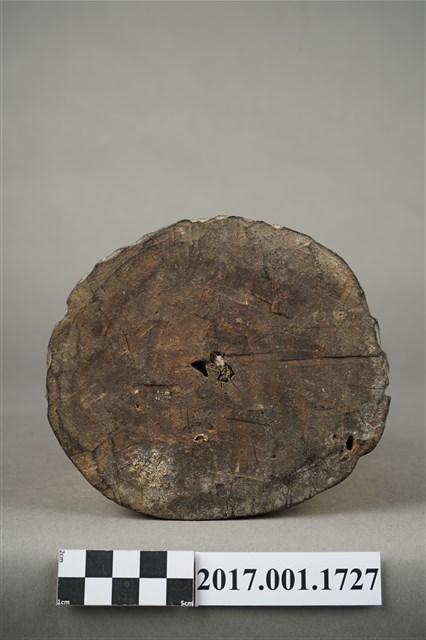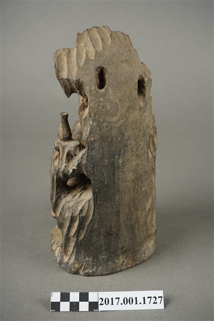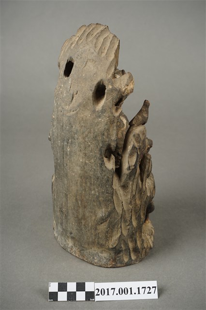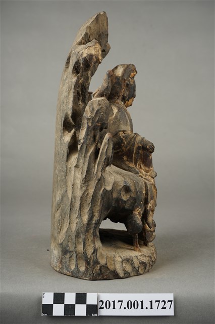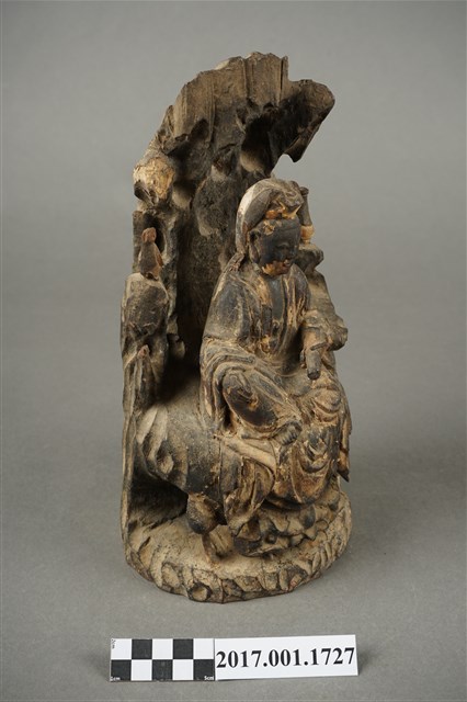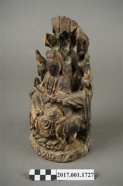 1.本件木雕觀世音菩薩像,作自在坐姿態,坐於岩座上,身後有延伸至頭頂之岩石寶蓋,為普陀巖觀世音菩薩造形,表面施作塗裝粧佛技法,局部漆面剝落。菩薩臉呈橢圓形,顏面表現雙眼垂視,山根塌、鼻樑短,頦肌收縮凸起,頭披衣巾,身著開襟袍服、披肩。右腿屈膝、左腿屈膝內伸,左手持書卷倚靠著岩石,右手放掌置於右膝。菩薩身後左側的岩石上置淨瓶、右側石柱上站著鸚鵡,岩座前下方有一朵盛開的蓮花,兩側各有花苞、蓮葉。