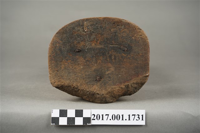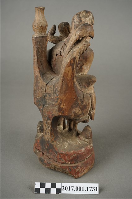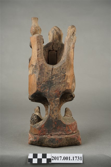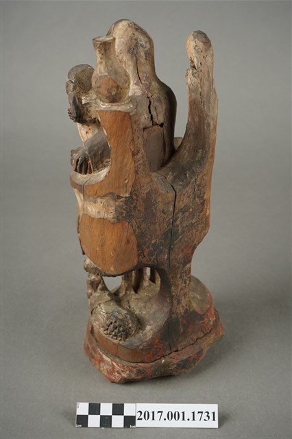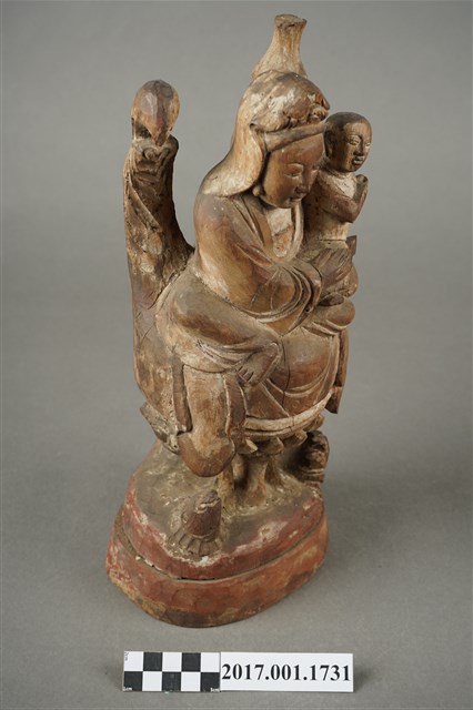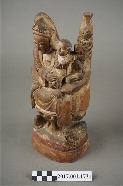1.本件木雕觀世音菩薩像,作自在坐姿態,坐於蓮座上,表面施作塗裝粧佛技法,漆面大多已清除,背面開有長方形入神洞,內容物件尚未取出。菩薩臉呈橢圓形,顏面表現雙眼垂視,山根塌、鼻樑短,頦肌收縮凸起,頭披衣巾、戴冠,身著開襟袍服、披肩。右腿屈膝、左腿屈膝內伸,雙手環抱著男孩。蓮座為仰蓮式,蓮座與臺座之間雕刻花莖、魚、龍,菩薩身後有延伸之石柱,菩薩左後方石柱上置淨瓶、右後方石柱上有鸚鵡。男孩頭無髮、張嘴,體態站在菩薩左膝上,左手高舉、右手橫置於胸前。