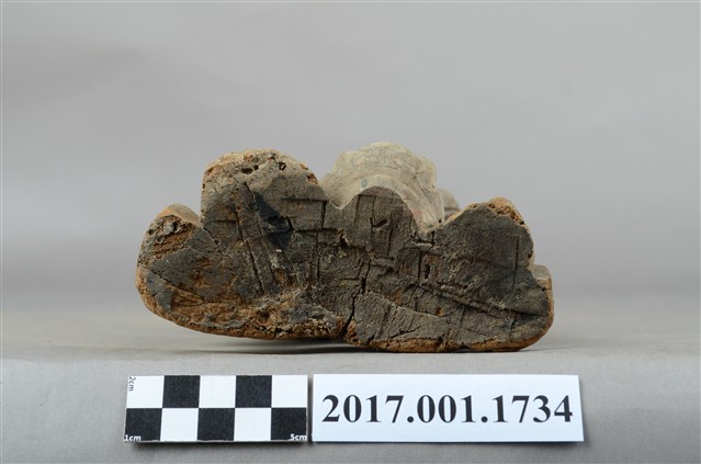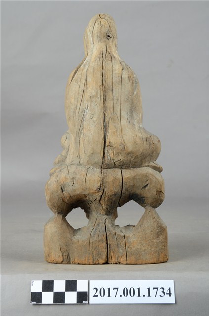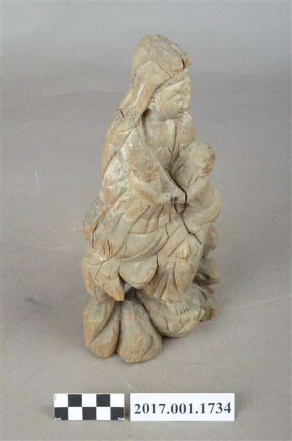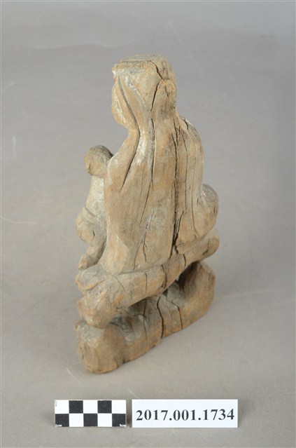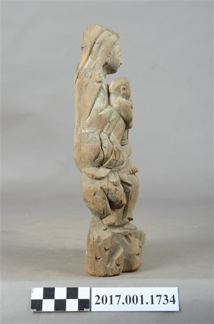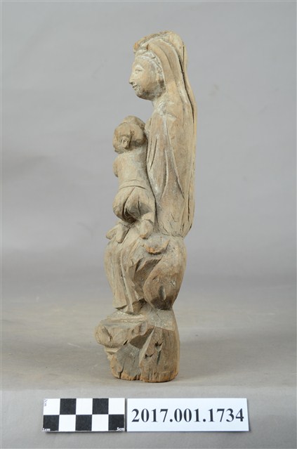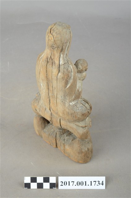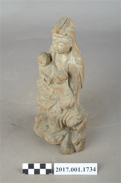 1.本件木雕觀世音菩薩像,作遊戲坐姿態,坐於岩座上,表面施作塗裝粧佛技法,漆面剝落嚴重。菩薩臉呈橢圓形,顏面表現雙眼垂視,山根塌、鼻樑短,頦肌收縮凸起,造像髮梳高髻,頭披衣巾,身著開襟袍服、披肩。左腿垂下、右腿屈膝內伸,左腳踏著蓮花,雙手環抱著幼童。本件送子觀世音菩薩像共雕刻兩位幼童,一位在菩薩懷中,一位趴在身上,幼童額頭留一小搓頭髮。