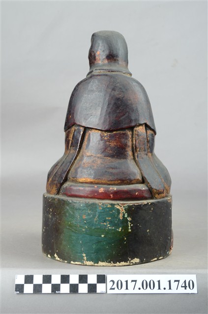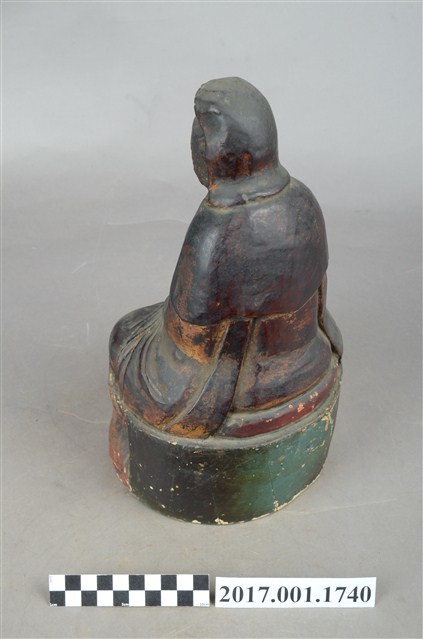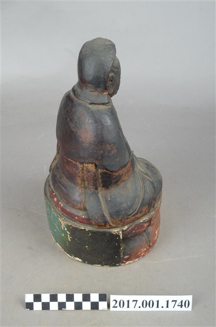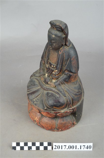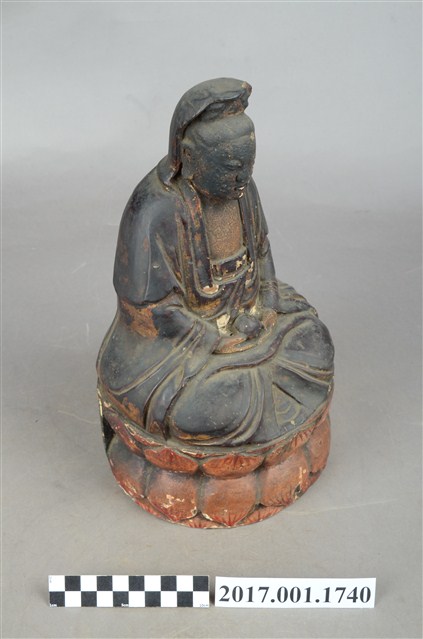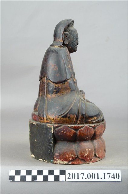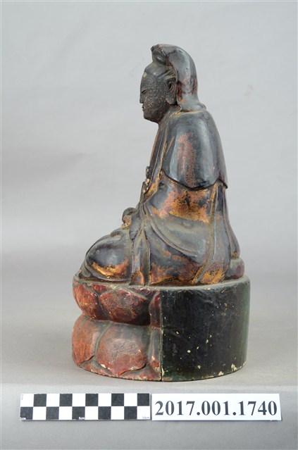 1.本件木雕觀世音菩薩像,作結跏趺坐姿態,坐於蓮座上,表面施作塗裝、安金不見紅粧佛技法,局部粧佛剝落。菩薩臉部呈橢圓形,顏面表現雙眼垂視,山根塌、鼻樑短,髮梳高髻,頭披衣巾、戴冠,身著開襟袍服、披肩。雙足盤腿,雙手相疊成禪定印置於腹前,掌中有摩尼珠。蓮座為束腰仰覆蓮式。