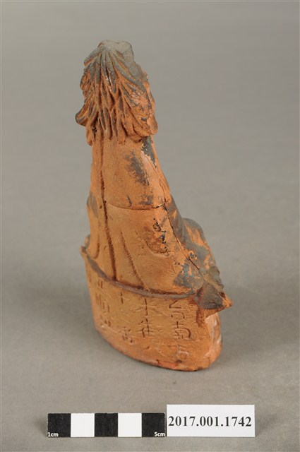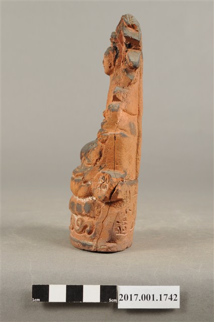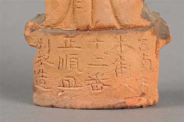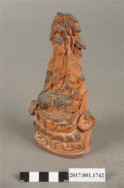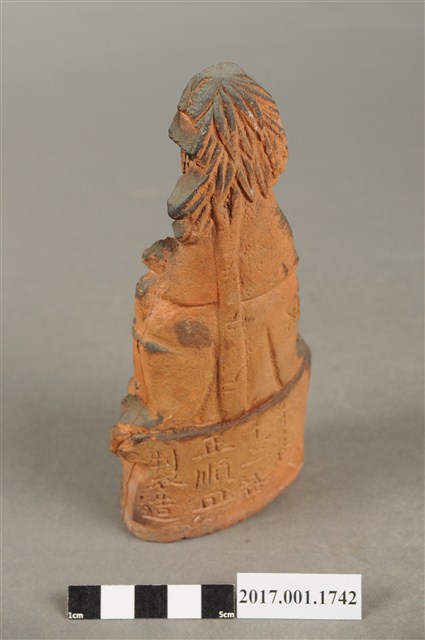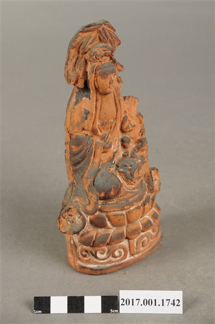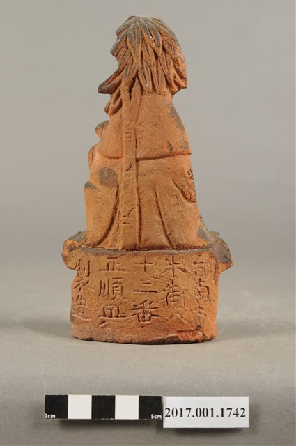 1.本件磚燒觀世音菩薩像,作結跏趺坐姿態,坐於蓮座上,身後有延伸之至頭頂竹林,為紫竹林觀世音菩薩造形,作法為造模翻製於表層素胎不上彩。菩薩臉型呈橢圓形,顏面表現山根塌、鼻樑短,髮梳高髻,頭披衣巾,身著開襟袍服、披肩。雙足盤腿,左手抱著幼童,右手按著腹部。蓮座為束腰仰覆蓮式,蓮座旁塑造蓮葉,蓮座下塑造花莖、捲草紋。菩薩所抱的幼童頭部損毀,身著肚兜,坐在菩薩的左膝上。本件背部銘刻「台南市米街八十二番正順興製造」,可斷定塑造時間在日治時期。