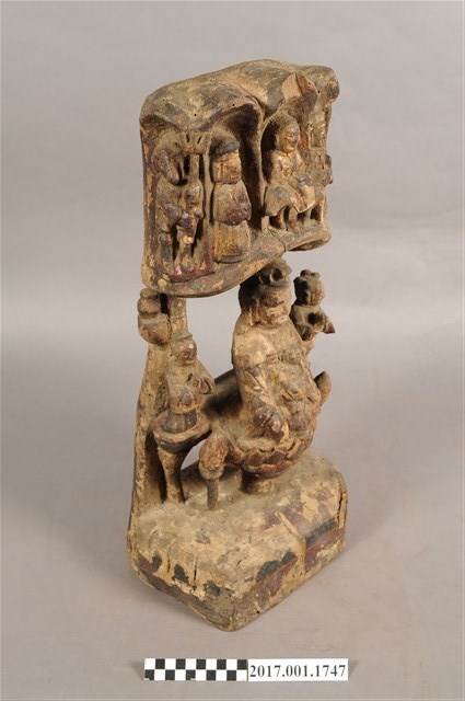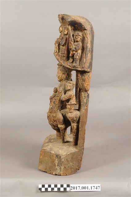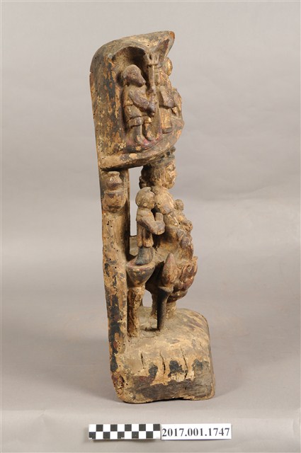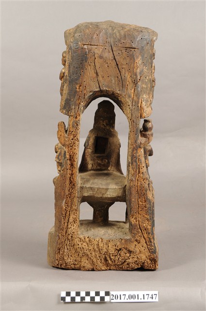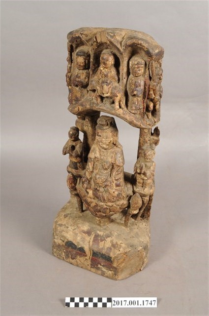 1.本件木雕觀世音菩薩像,表面施作塗裝、安金不見紅粧佛技法,粧佛剝落嚴重,背面開有長方形入神洞,內容物件已取出。菩薩臉部呈橢圓形,顏面表現閉眼,山根塌、鼻樑短,髮梳高髻,頭披衣巾,身著開襟袍服、披肩,坐於蓮座上。右腿屈膝、左腿屈膝內伸,左手抱著孩童,右手放掌置於右膝。蓮座為仰蓮式,蓮座與臺座之間有花莖,蓮座兩側雕刻花苞。觀世音菩薩身後雕塑如拱門般的牌坊,在菩薩身旁分別雕刻立姿善財童子與龍女,善財童子頭頂梳雙髻,上半身著窄袖衣、下半身著長褲,雙手合十,後方柱子上疑似雕刻鸚鵡。龍女肩披雲肩,上半身著衣、下半身著裳,裳前有蔽膝、雙手合十,後方柱子上雕刻淨瓶。牌坊上方有五個神龕,中間神龕雕刻騎著坐騎的神祇,神祇頭無戴冠,雙手持物,推測為地藏王菩薩,左右神龕分別雕刻頭戴冠、身著長袍、持笏的神祇,推測為閻羅天子,外側神龕雕刻獸面神將,左側神將持長劍、右側神將持三叉戟,其中右側神將可判斷為雕刻馬頭,推測兩位神將是牛頭與馬面。