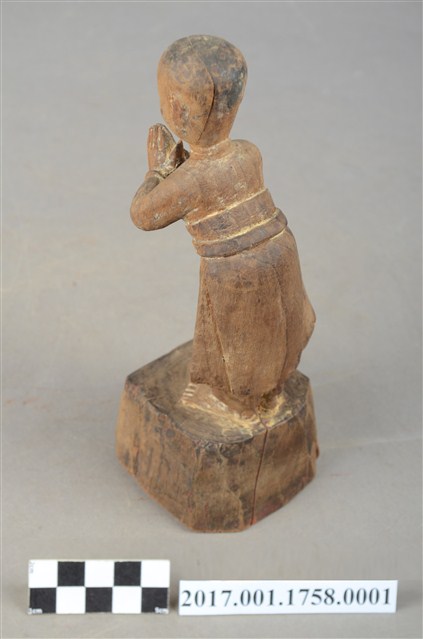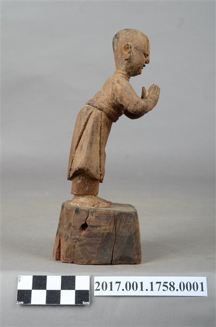 1.本件木雕善財童子像,作站姿姿態,表面施作塗裝粧佛技法,漆面剝落嚴重。善財童子作孩童臉,下半身著長褲、外圍裙、腰繫腰帶,雙手佩戴手釧。跣足,立像挺身以雙足並立的姿態站於臺座上,雙手合十置於胸臆前。