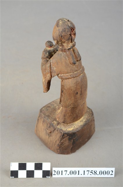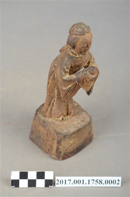 1.本件木雕龍女像,作站姿姿態,表面施作塗裝粧佛技法,漆面剝落嚴重。龍女臉部修長,高額圓潤,雙目半睜,髮梳髻,肩披雲肩、身著寬袖衣、下身著裳,腰繫腰帶,腳穿弓鞋。立像挺身以雙足並立的姿態站於方形臺座,雙手高舉盤托珠置於胸前。