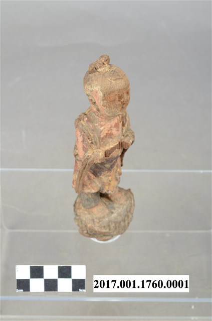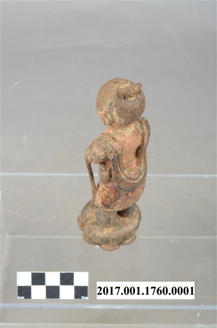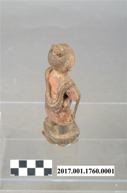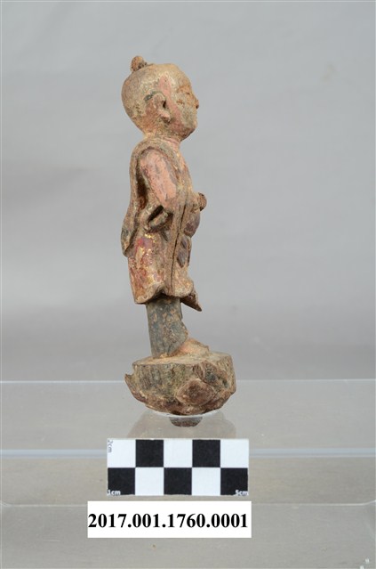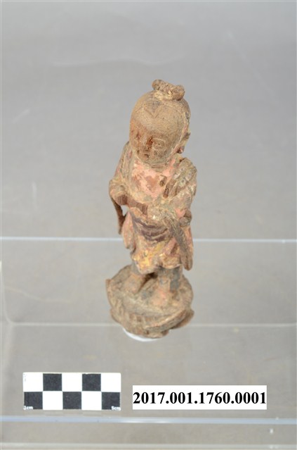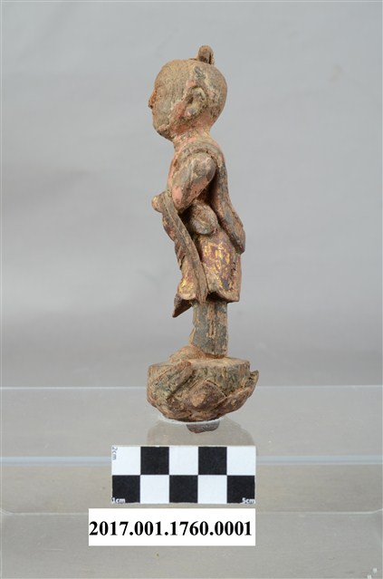 1.本件木雕善財童子像,作站姿姿態,表面施作塗裝、安金不見紅粧佛技法,粧佛剝落嚴重。善財童子作孩童臉,雙目半睜,頭頂梳雙髻,上半身赤裸,下半身著長褲,長褲外圍著裙,腰繫布帶,披一條飄帶。跣足,立像挺身站於蓮座上,雙手的手掌缺失,推測應是雙手合十置於胸前。蓮座為仰蓮式。