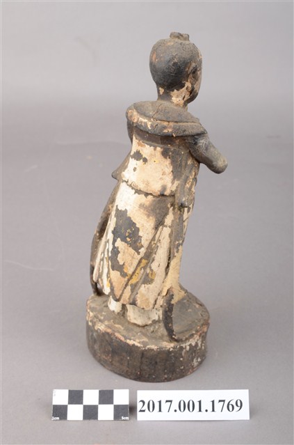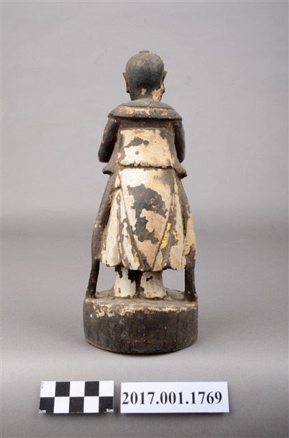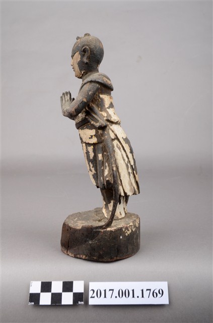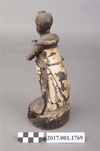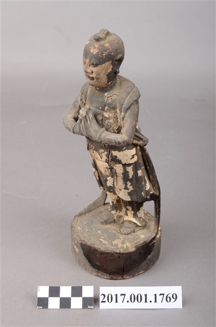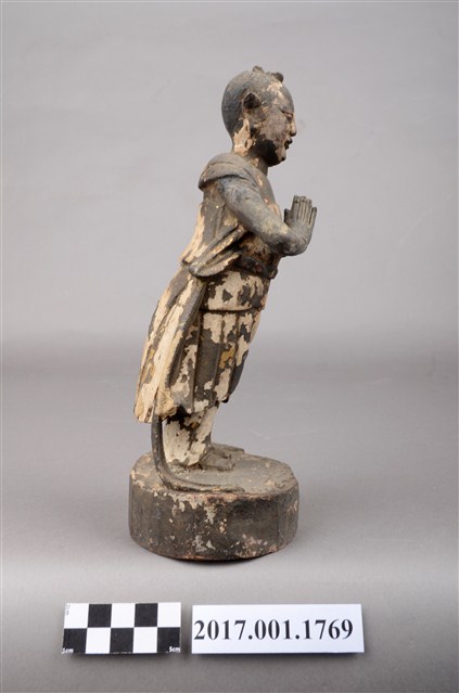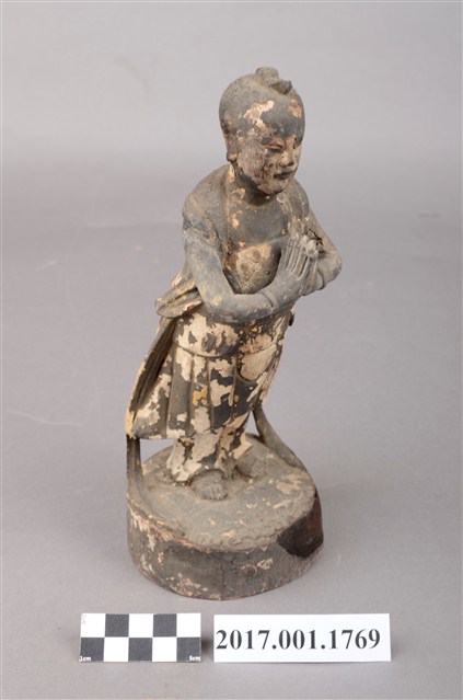 1.本件善財童子採合掌膜拜的立姿姿態,以木雕方式製作,表面粧佛已脫落。善財童子站在一木臺座上,底部平整,有一小洞及一裂紋。善財童子頭頂正前方,頂一撮垂髫,身穿軟服,雙手合掌膜拜,兩側飄帶垂地。善財應與另一位脅侍龍女共同搭配,主尊則為觀世音菩薩,形成三位一組之作用,原先的觀世音與龍女則未知下落。