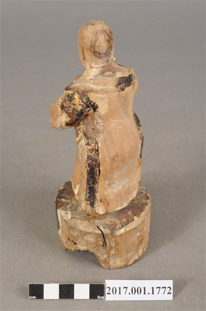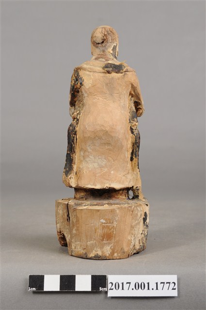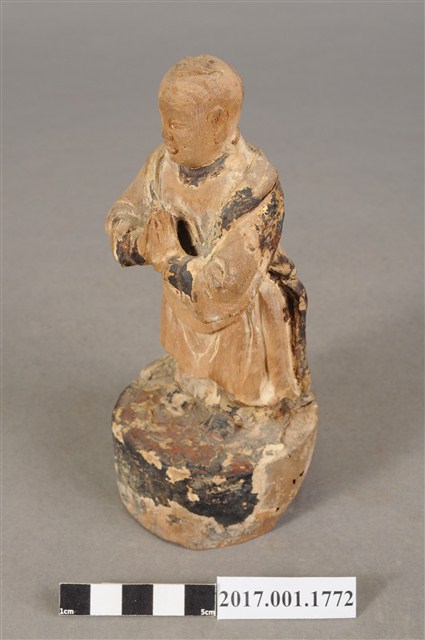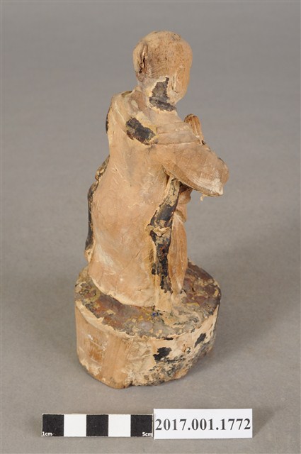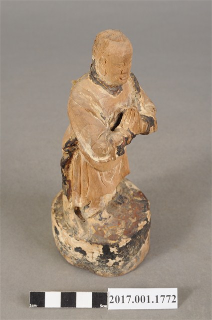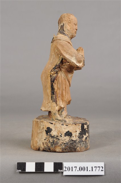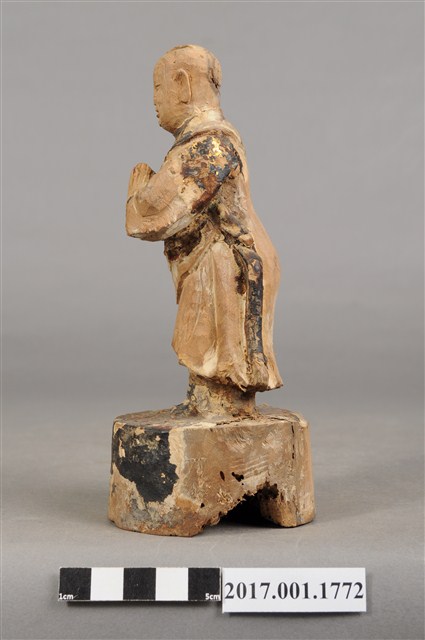 1.本件木雕善財童子像作立姿,表面大部分脫落,僅殘留衣袍、臺座青黑色,臺座底部一道V字形蛀蝕缺口與孔。善財童子作孩童臉,臉型修長,雙眼平視,頭頂梳單瓣垂髫,身著窄袖過膝圓領袍服、長褲,雙手合十於胸前,作朝拜狀,腰間繫有腰帶。雙足並立,著黑靴,站立於圓臺上。